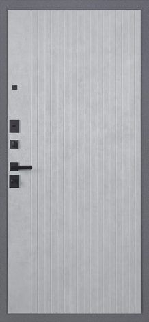 Покрытие двери — «Букле графит». Внешняя отделка выполнена из листа металла толщиной 1,5 мм с фигурным наличником. Нижний замок — цилиндровый Galeon 816, верхний — сувальдный Galeon 817. Фурнитура включает ручку, глазок и ночную задвижку на квадратной розетке цвета «черный». Дополнительно предусмотрены евроцилиндр К-В (перфокарта), врезная броненакладка и три противосъёмных штыря. Тип открывания — правое и левое.