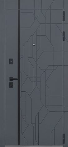 Толщина полотна составляет 100 мм, дверная коробка с тремя контурами уплотнения имеет глубину 90 мм. Внешняя отделка выполнена металлическим листом 1,5 мм и МДФ-панелью 10 мм цвета «графит» с вертикальной вставкой из черного лакобеля. Горизонтальный наличник МДФ 150 мм и вертикальный 100 мм продолжают декоративный дизайн. Внутренняя отделка — МДФ 10 мм цвета «белый матовый» с декоративными молдингами 10 мм черного цвета. Дополнительно установлены евроцилиндр К-В (перфокарта), врезная броненакладка и три штыря противосъемные. Упаковка двери: 2140×1040×130 мм и 2140×1130×130 мм.