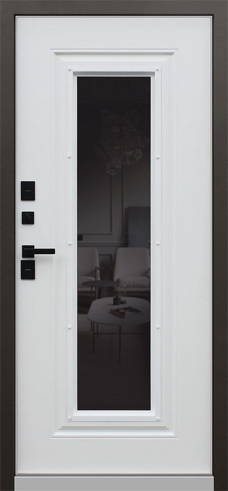 - Внутренняя отделка: панель МДФ 16 мм, цвет «белый матовый», тонированный стеклопакет, прижимная рамка, объемная фрезеровка вокруг стеклопакета