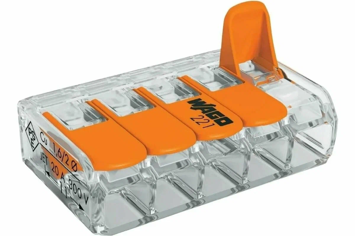 Клеммы WAGO 221-415 для проводов представляют собой крепеж обжимного типа, предназначенный для подключения любых типов медных проводников моножильных и многопроволочных сечением 0,14 – 4 мм2. Прекрасная эргономика клеммы обеспечивается особыми вырезами со стороны ввода проводов. При помощи такой клеммы можно крепко соединить несколько проводов, обеспечив электроконтакт.