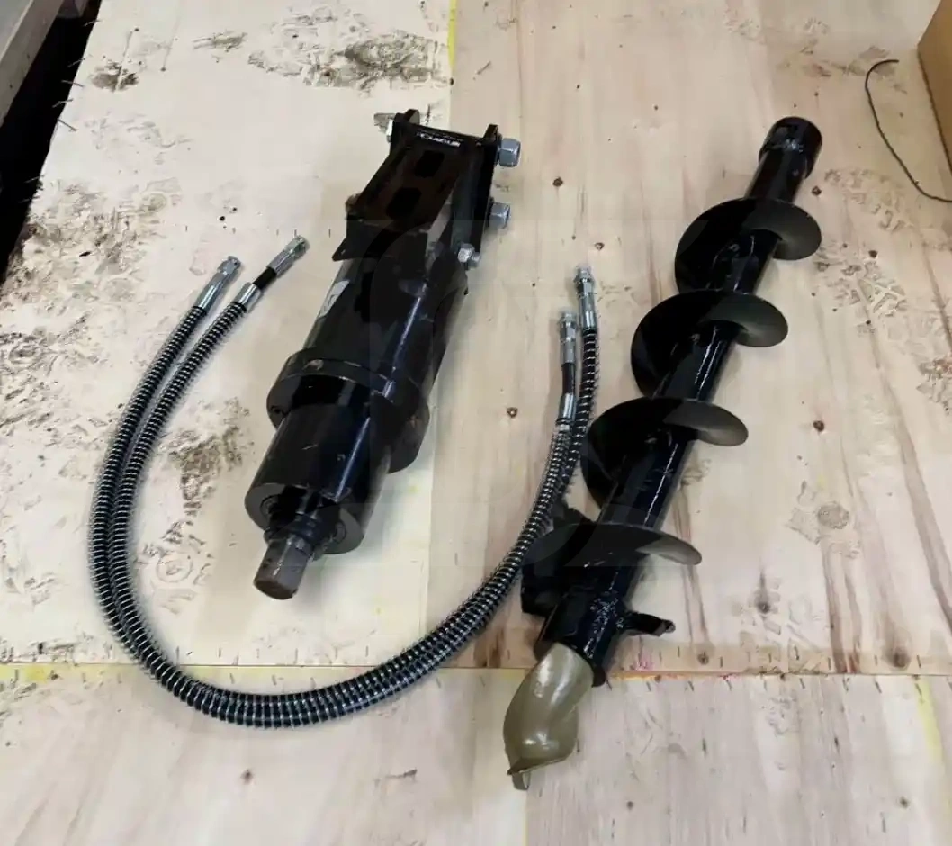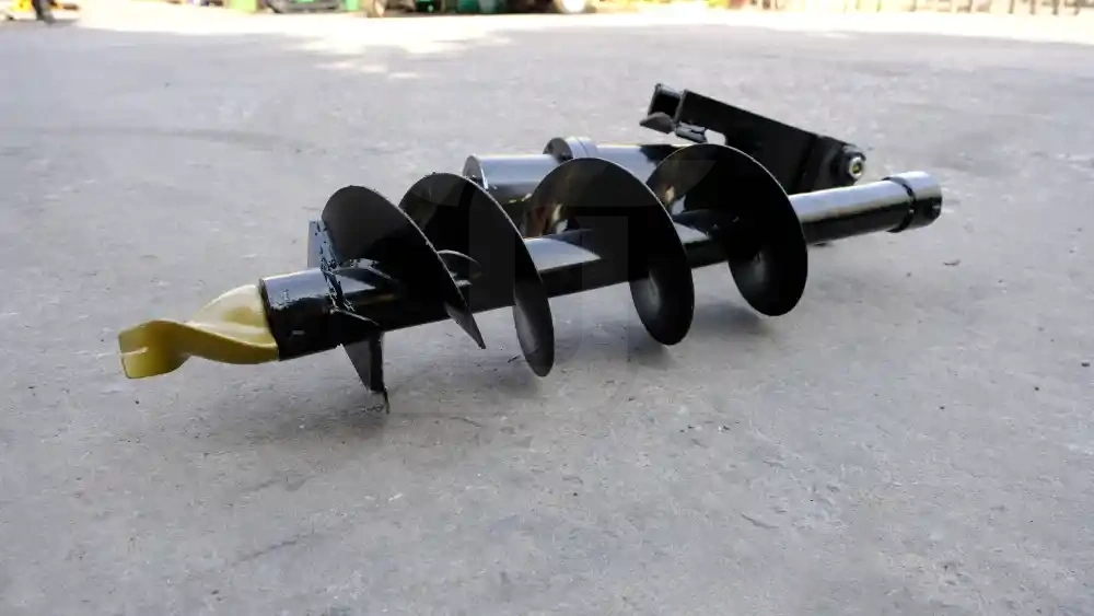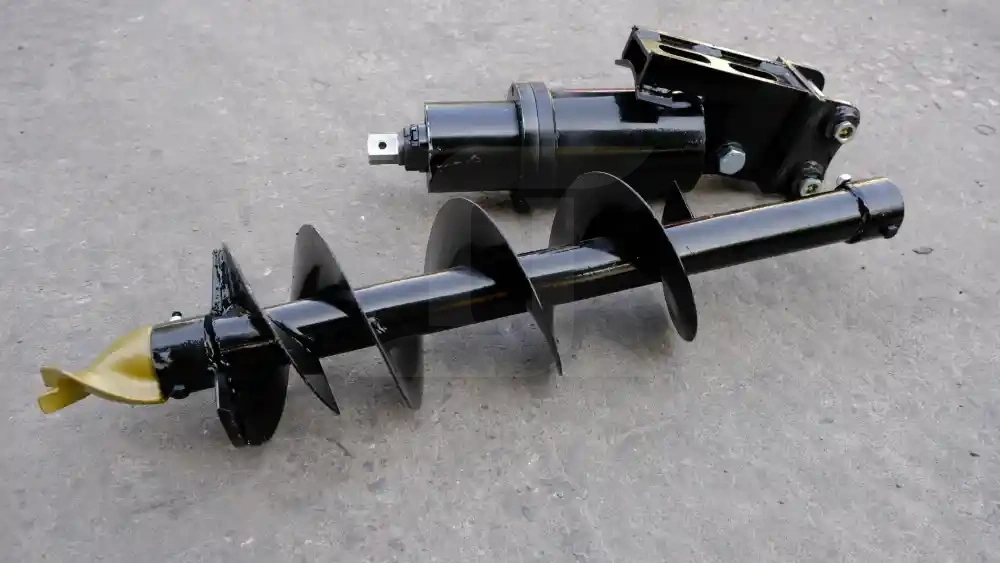 Шнековый бур – это дополнительное навесное устройство для бурения отверстий в грунте. Оснащён вращающимся винтом (шнеком) с режущими кромками, который при вращении режет грунт и одновременно выталкивает его на поверхность, что позволяет быстро бурить землю.
