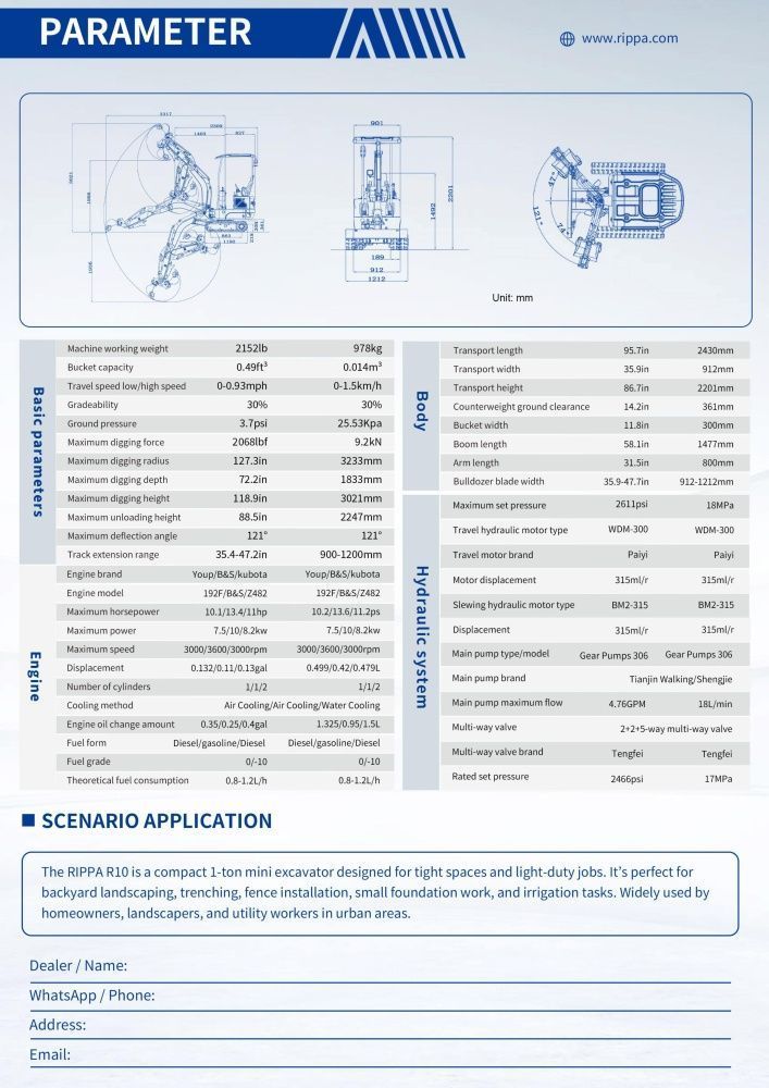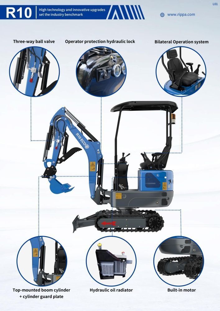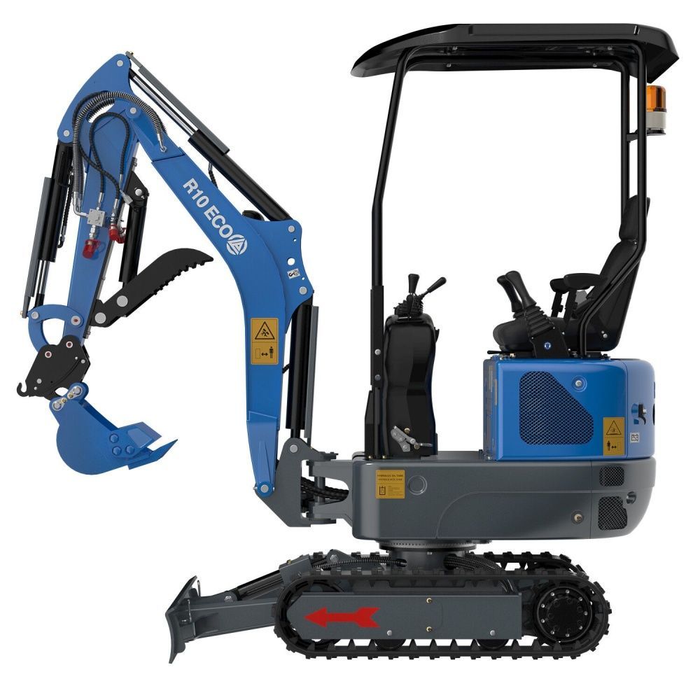 Мини-экскаватор R10 — это компактная и мощная машина с эксплуатационным весом 1000 кг и максимальной мощностью 8,2 кВт. Он идеально подходит для работы в ограниченных пространствах, обеспечивая максимальную глубину копания до 1833 мм и высокую маневренность.