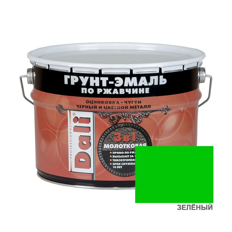 Эффектная зелёная эмаль для металла с чеканным эффектом. Помимо декоративных функций, выполняет защиту поверхности от коррозии, застаревшей ржавчины, непогоды, УФ-лучей и загрязнителей. Используется снаружи и внутри помещений для восстановления и окрашивания дверей, ворот, скамеек, кованых изделий, офисных боксов. Наносится без грунтовки на очищенную от рыхлого ржавого слоя поверхность и высыхает за 2 часа, образует прочный упругий слой без разводов и подтёков даже на вертикальных поверхностях. Устойчива к температурным перепадам, трению и царапинам, воздействию масел и кислот. Применяется для чёрных и цветных металлов, а также оцинкованных поверхностей.