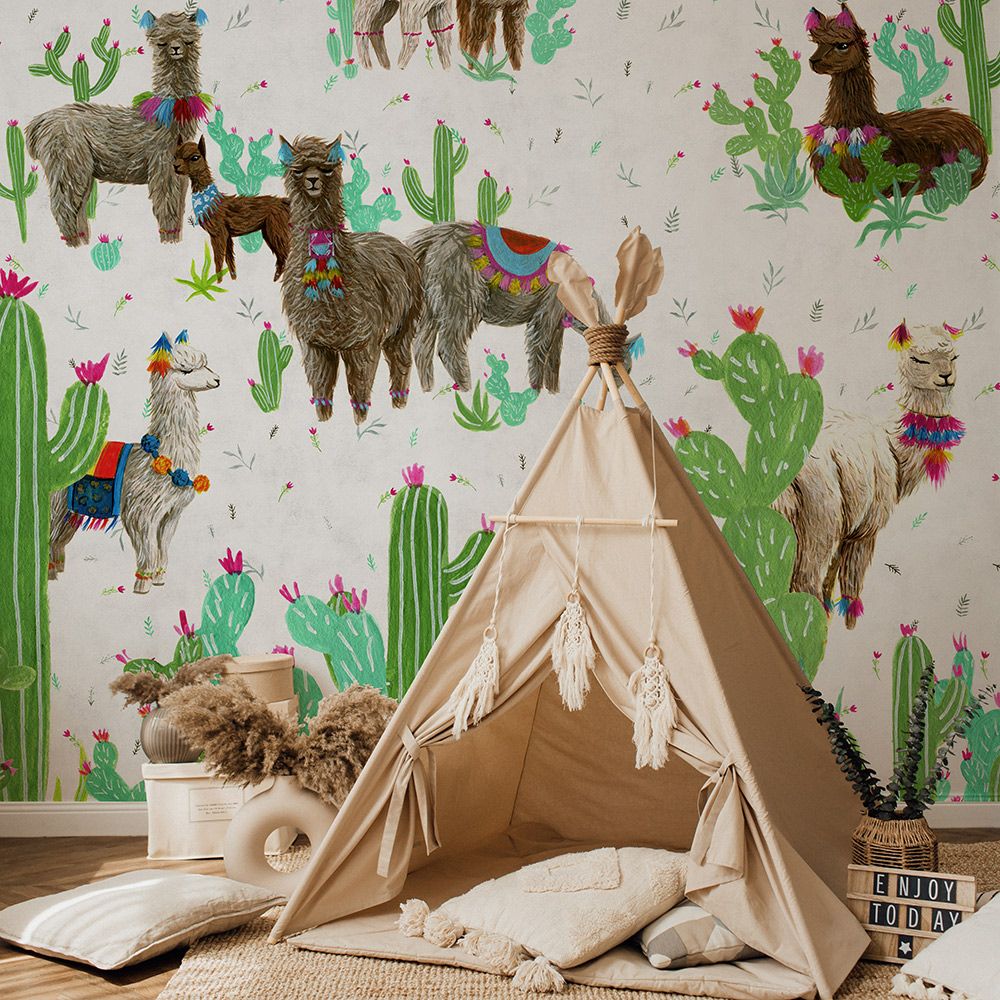 ALPAKA – модель из коллекции 2022 года, специально разработанная дизайнерами для спальни или комнаты ребенка. Простой и в тоже время привлекающий внимание сюжет выполнен в виде сценки из жизни дикой природы Перу. Среди зарослей кактусов можно увидеть стайки жизнерадостных альпак. Цветовая гамма специально подобрана из расчета на использование обоев в детской комнате. Она светлая, приятная на взгляд, помогает создать в помещении благоприятную атмосферу.