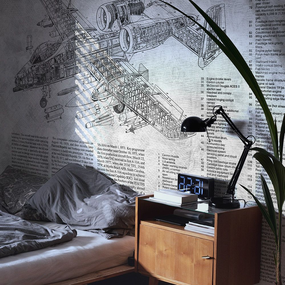 BATTLE PLANE – настоящий подарок для мальчика-подростка, который увлекает авиационной тематикой. Обои выполнены в строгом стиле, основной рисунок – схематическое изображение военного самолета, где каждый узел и деталь отмечены, указано их название.