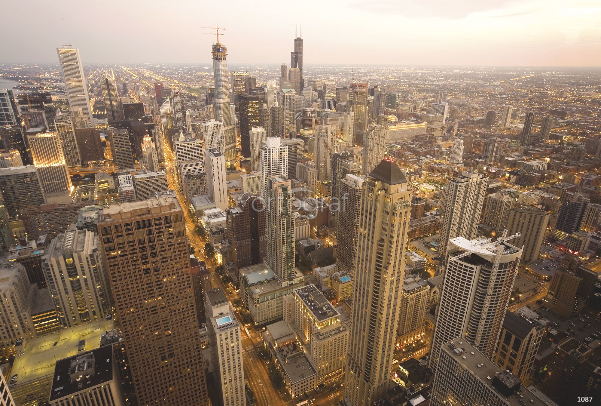 На изображении представлен панорамный вид большого современного города с высотными небоскрёбами, освещёнными улицами и развитой городской инфраструктурой. Горизонт уходит вдаль, создавая впечатление масштабности и плотной застройки мегаполиса.