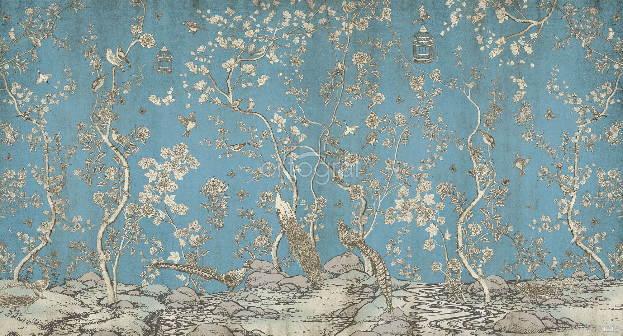 Графичная композиция: тонкие деревья с цветами, множеством птиц и павлинов, а также декоративными клетками на фоне насыщенного голубого цвета. Изображение создаёт атмосферу восточной сказки, утончённости и уюта, отлично впишется в интерьер, где важны индивидуальность и яркие акценты.