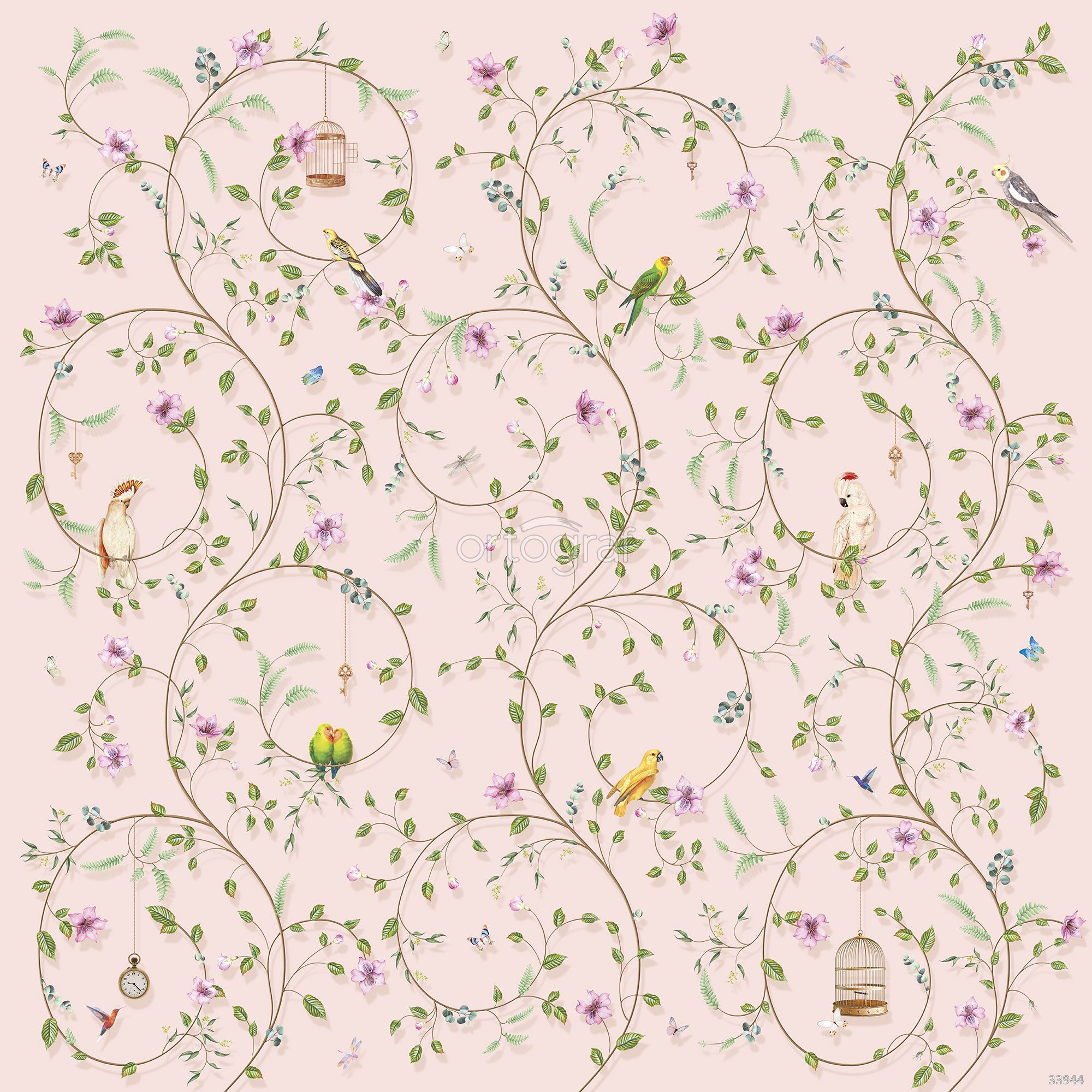 Замысловатый орнамент из витых ветвей с цветами, экзотическими попугаями, клетками, ключами и часами создает необычное и сказочное настроение. Такой сюжет наполняет интерьер ощущением уюта, фантазии и лёгкости, способствует творчеству и расслаблению. Особенно хорошо подойдет для оформления детской, кухни, столовой или гостиной, делая атмосферу живой и вдохновляющей.