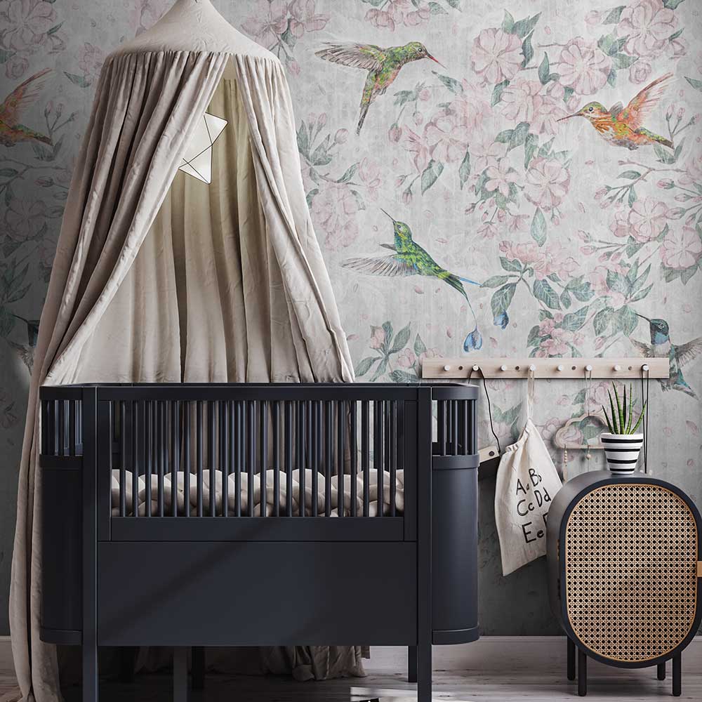 COLIBRI – обои, посвященные тропическому цветущему саду и порхающим посреди цветов миниатюрным колибри. Покрытия переносят в райский уголок, дарят наслаждение спокойствием и гармонией. Кажется, что слышны легкие дуновения ветерка, который колеблет веточки и бутоны цветов, наполняя помещение тонким ароматом. Посреди цветов можно заметить ярких экзотических птиц – миниатюрных колибри, крылышки которых кажется сейчас затрепещут.