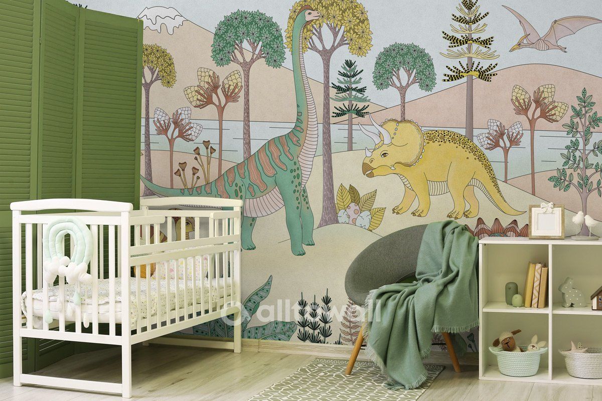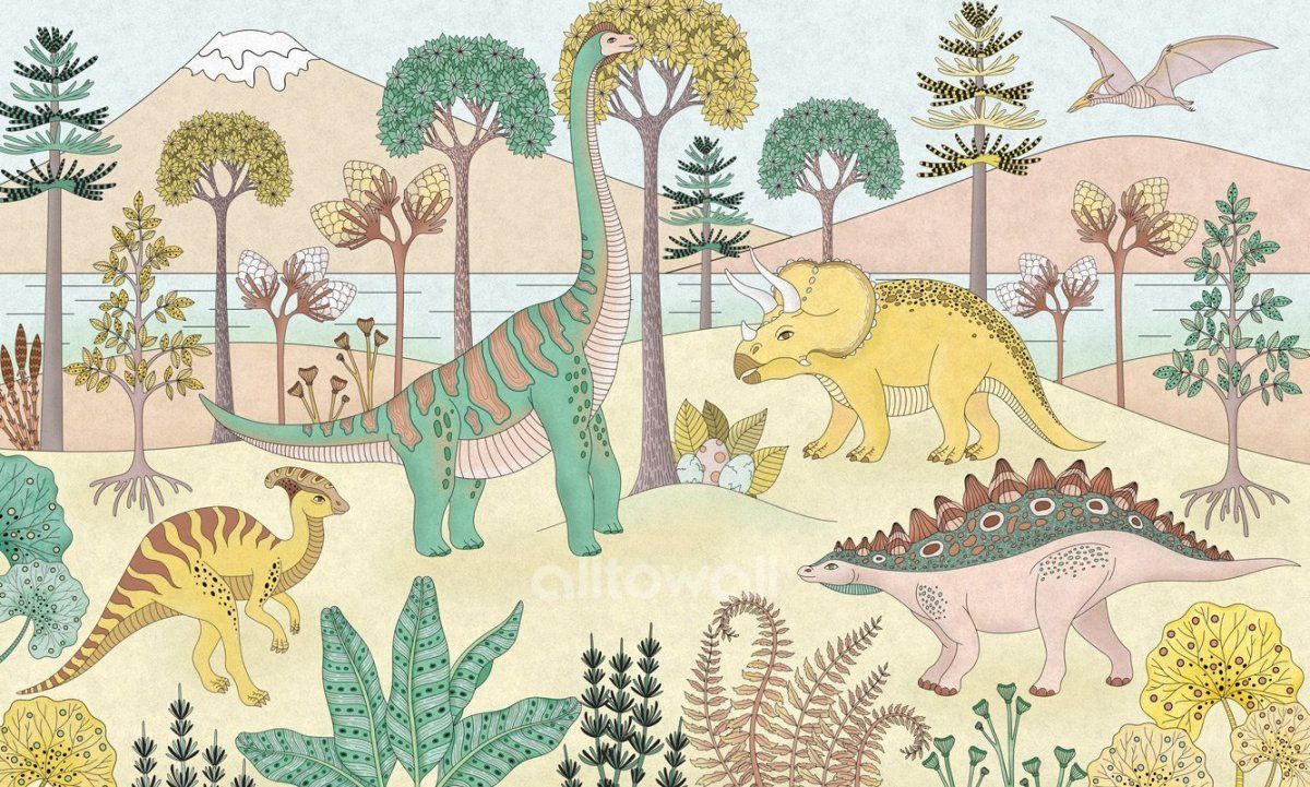 Красочные обои для детской комнаты с разнообразными динозаврами, древними растениями и снежными горами. «До нашей эры-1» — познавательный сюжет для будущих палеонтологов.
