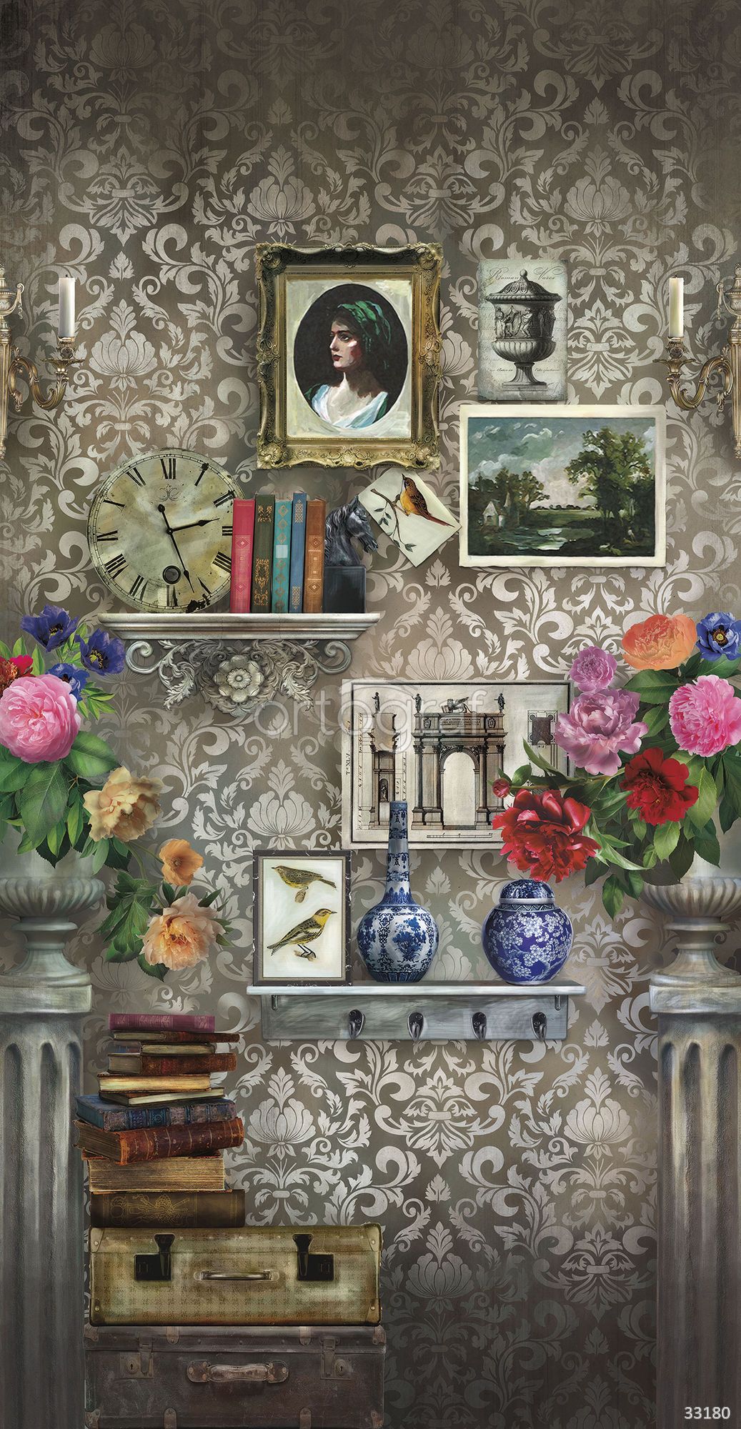 На изображении представлена композиция в стиле винтажного кабинета: на фоне классических обоев размещены полки с книгами, часы, картины, цветочные букеты в вазах, подсвечники и колонны, а внизу лежит стопка чемоданов. Такая атмосфера придаёт интерьеру дух старины, интеллигентности и уюта, наполняя пространство нотками истории и эстетики европейской классики.