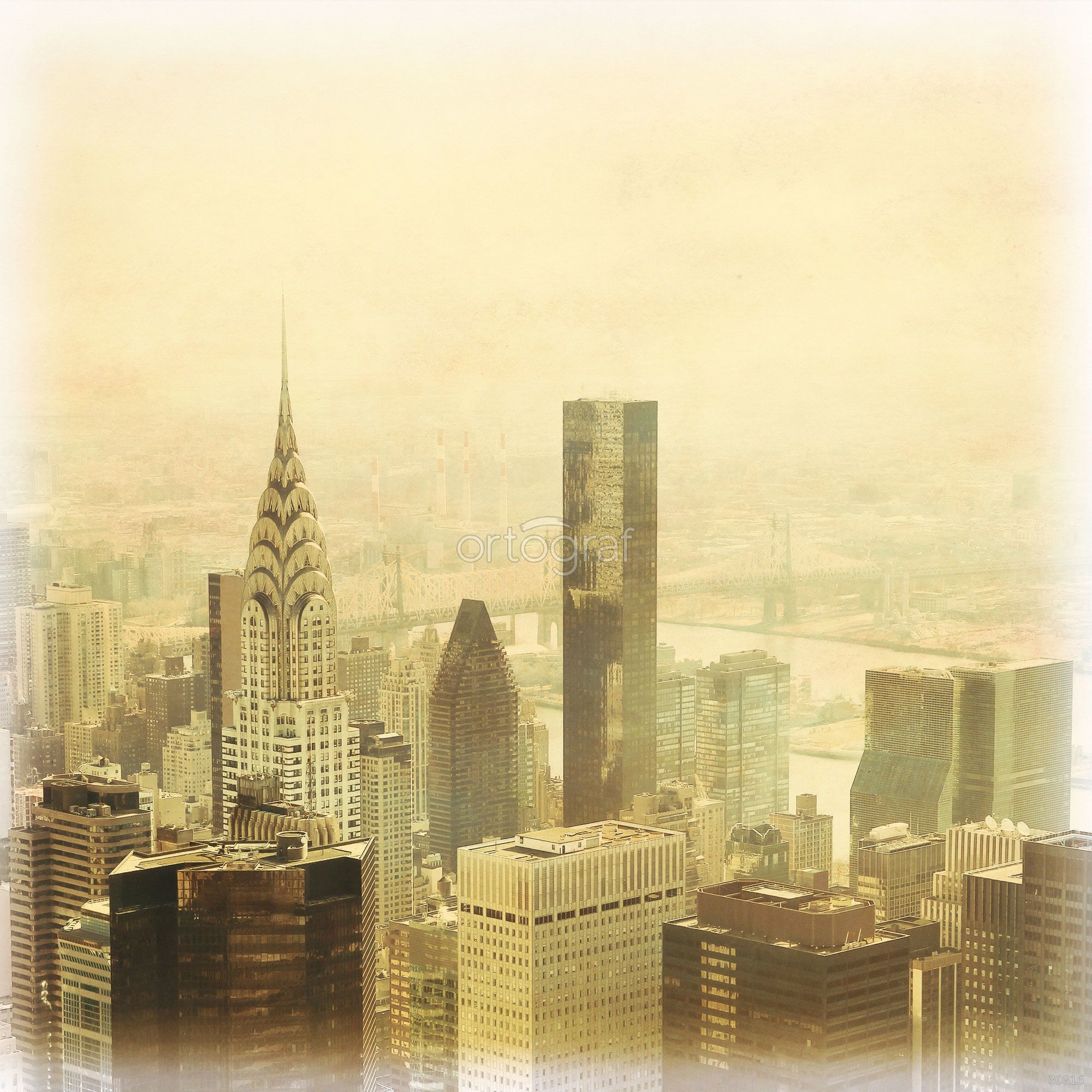 Стилизованный городской пейзаж с небоскребами и мостом, выполненный в ретро-манере с эффектом «выцветшего» снимка, создает атмосферу ностальгии, мягкости и уюта. Такой сюжет отлично подходит для современных и классических интерьеров, добавляя индивидуальность и легкий винтажный акцент.