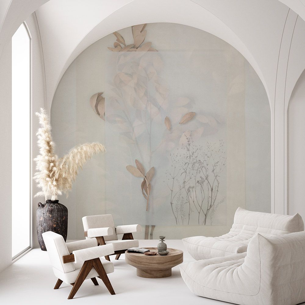 EVIGILATIO – настоящая ода переменчивости и непостоянства, сочетающихся с гармонией и утонченностью. Для обоев использованы разные техники рисунка, что придает изображению глубину, делает его более «живым». Кажется, что вместо стены располагается панель из матового стенка, покрытого каплями дождя, за которой в легкой дымке можно увидеть листья, трепещущие на легком ветру.