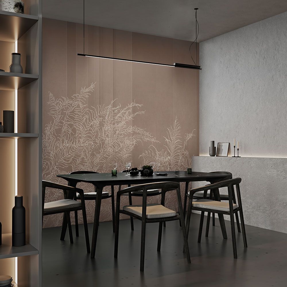 Модель разработана для интерьеров в стиле soft-minimal. Она легкая, отличается ненавязчивым, спокойным сюжетом. На фоне вертикальных полос тонкими белыми линиями нанесены контуры папоротника, листва которого словно развевается на ветерке. Художниками разработаны разные цветовые варианты – от серебристо-серого до темного. Такие обои подходят для фонового оклеивания, визуального увеличения высоты потолка, создания иллюзия пространства.