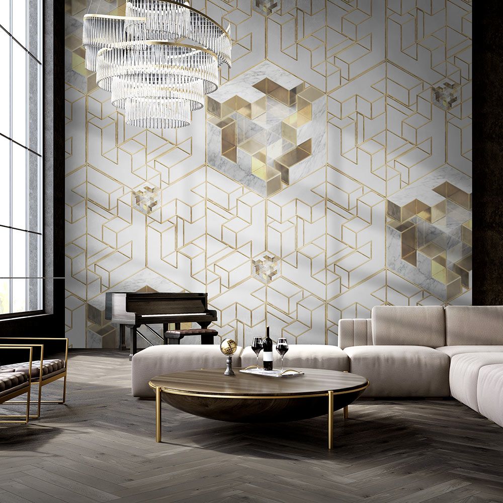 Обои FORMULA из коллекции покрытий 2022 года посвящены строгим геометрическим фигурам. На светлом фоне с мягкими переливами оттенков выделяется золотистая решетка фигур, которые множатся буквально на глазах, создавая иллюзию многомерного пространства. В ключевых точках выделяются большие и малые фигуры, благодаря которым визуально обеспечивается эффект уходящего вглубь пространства мягкие блики мраморных и золотых поверхностей имитируют объем и легкое, едва уловимое движение.