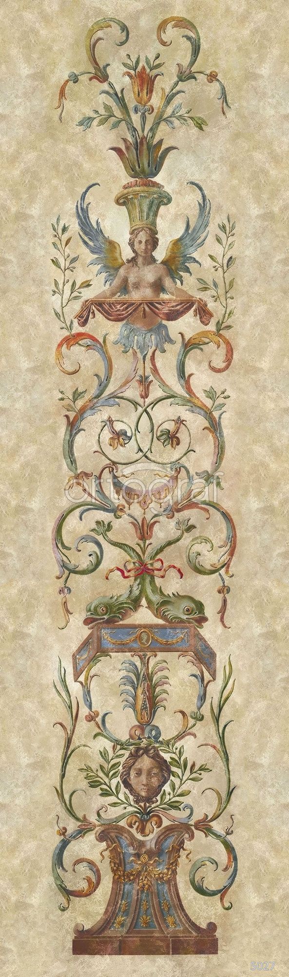 Вертикальный рисунок с классическим орнаментом, изображающий декоративные вазы, цветочные композиции, крылатого ангела и стилизованных дельфинов. Композиция наполнена деталями и завитками, создаёт ощущение утончённости и аристократичного стиля. Такой сюжет придаёт интерьеру изысканность и harmonию, идеально вписывается в классические пространства.
