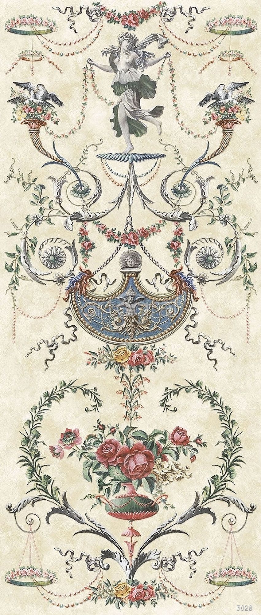 Вертикальный рисунок с классическим орнаментом, изображающий декоративные вазы, цветочные композиции, крылатого ангела и стилизованных дельфинов. Композиция наполнена деталями и завитками, создаёт ощущение утончённости и аристократичного стиля. Такой сюжет придаёт интерьеру изысканность и harmonию, идеально вписывается в классические пространства.