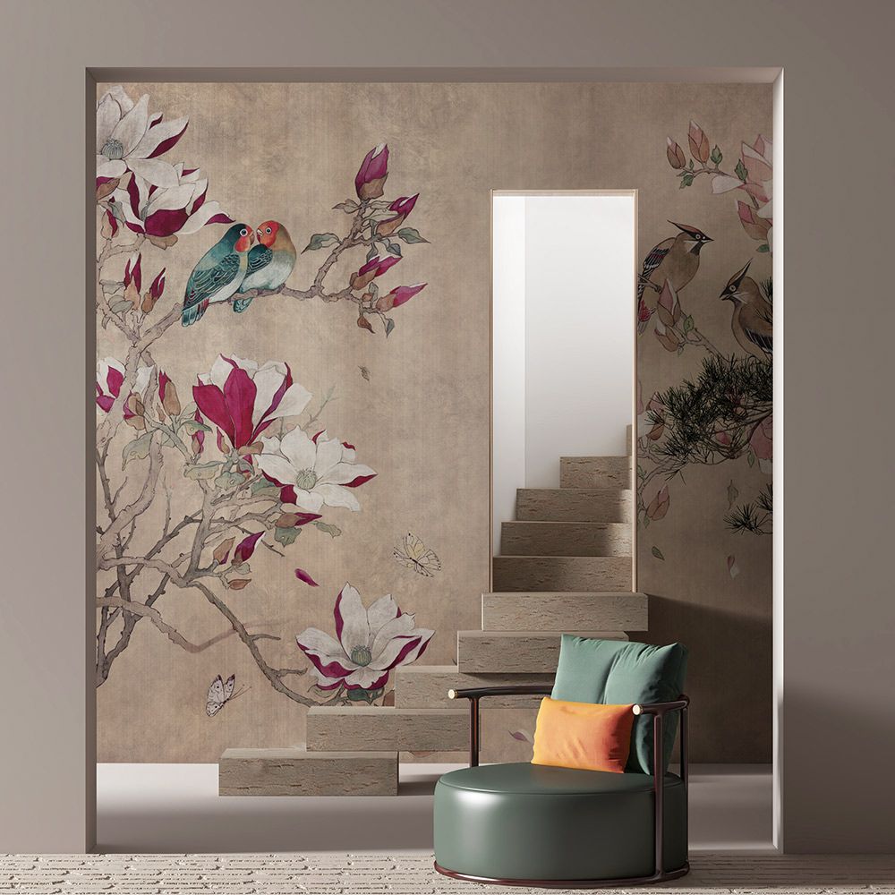 Обои выполнены на основе, имитирующей старинную бумагу или ткань с нанесенными в особой технике рисунками. Для таких покрытий подходит фактура «холст», позволяющая передать утонченность рисунка, сделать изображение динамичным. На светлом или темном фоне выделяются ветви деревьев, на которых распускаются яркие бутоны. Кажется, что они источают дивный аромат, наполняющий помещение и привносящий в обстановку чувство гармонии. Над цветами порхают яркие бабочки, на ветвях поют песня экзотические птицы.