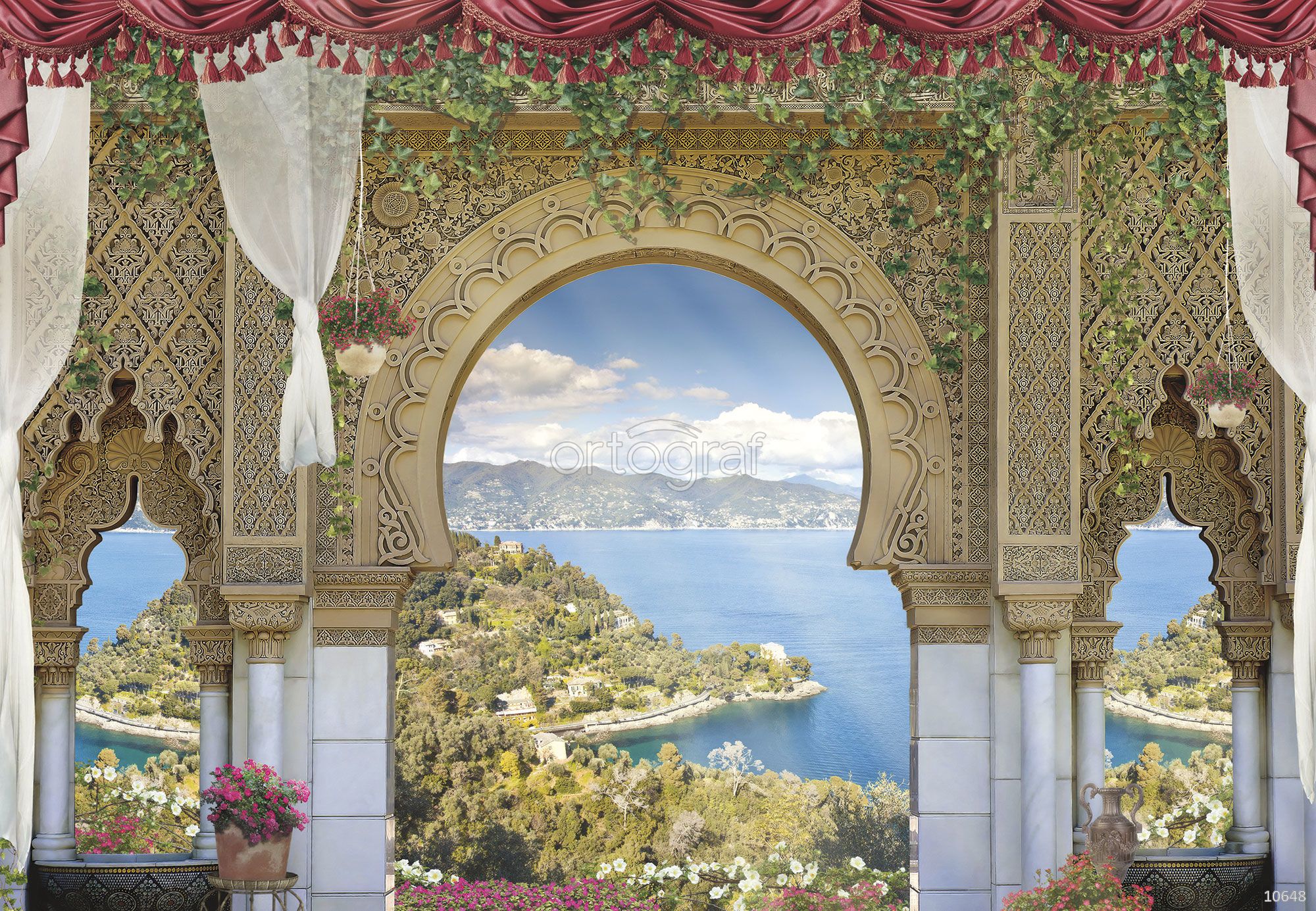 На изображении представлены ажурные арки восточного дворца с детализированными резными орнаментами и колоннами, обрамлённые пышной зеленью и цветущими вазонами. Через центральную арку открывается потрясающий вид на лазурное море, живописные скалы с виллами и горы на горизонте, создавая атмосферу уюта и экзотической роскоши с элементами восточной архитектурной эстетики.