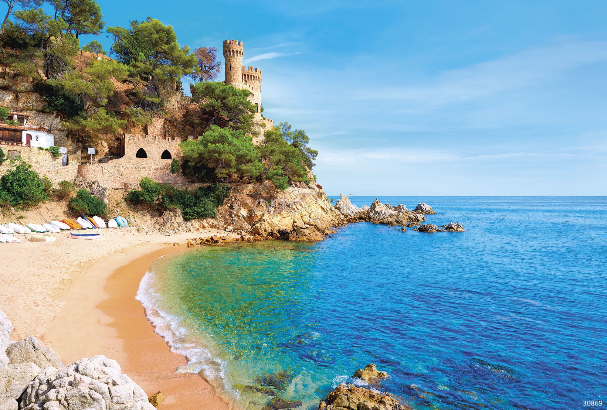 Красивый участок морского побережья с крепостью на скале, окружённый песчаным пляжем, скалами и лодками, создает атмосферу спокойствия, легкости и отпуска. Такой сюжет отлично расширяет пространство, придаёт интерьеру ощущение свободы и романтики, наполненный природными и архитектурными акцентами.
