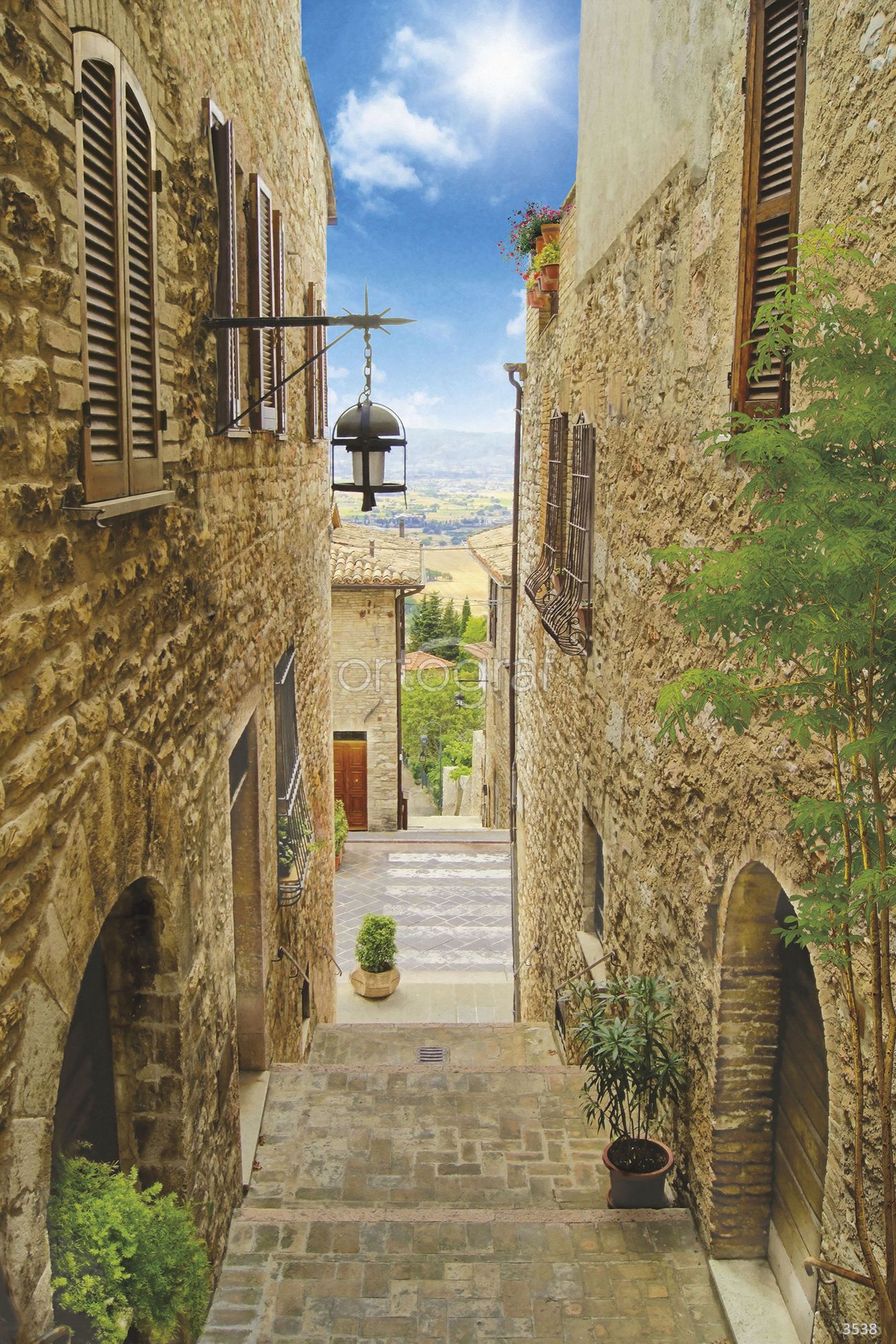 Уютная улочка старого города с каменными стенами и окнами с деревянными ставнями создает атмосферу европейского спокойствия. Открывающийся вдаль вид наполняет пространство ощущением перспективы и путешествия. Такой сюжет оживит интерьер и добавит ему светлых и гармоничных нот.