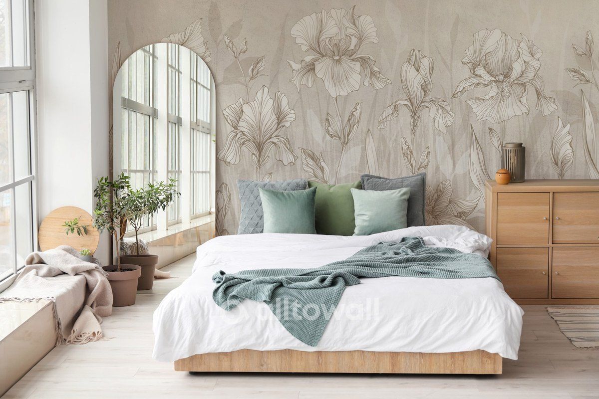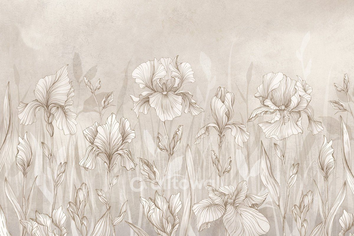 Нежные обои с крупными цветами в тёплых бежевых тонах для спальни или гостиной. «Изящные ирисы-1» — изысканный сюжет с имитацией фрески.