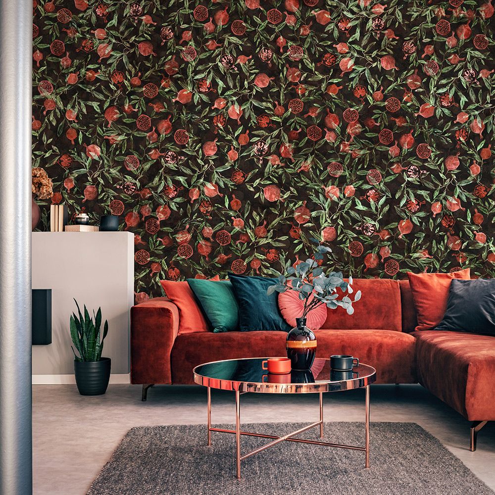 • для гостиной со смелым и ярким дизайном можно выбрать покрытия с темным фоном и сочными изображениями гранатовых деревьев, модель подходит для фоновой оклейки или выделения одного акцента;