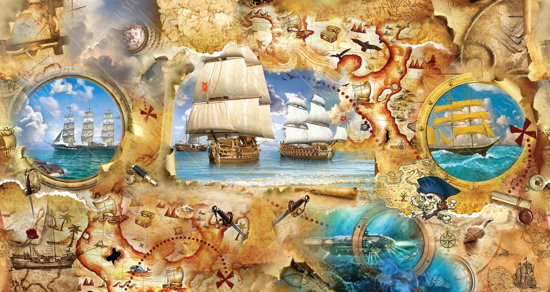 Фреска Карта сокровищ, корабли и окна каюты