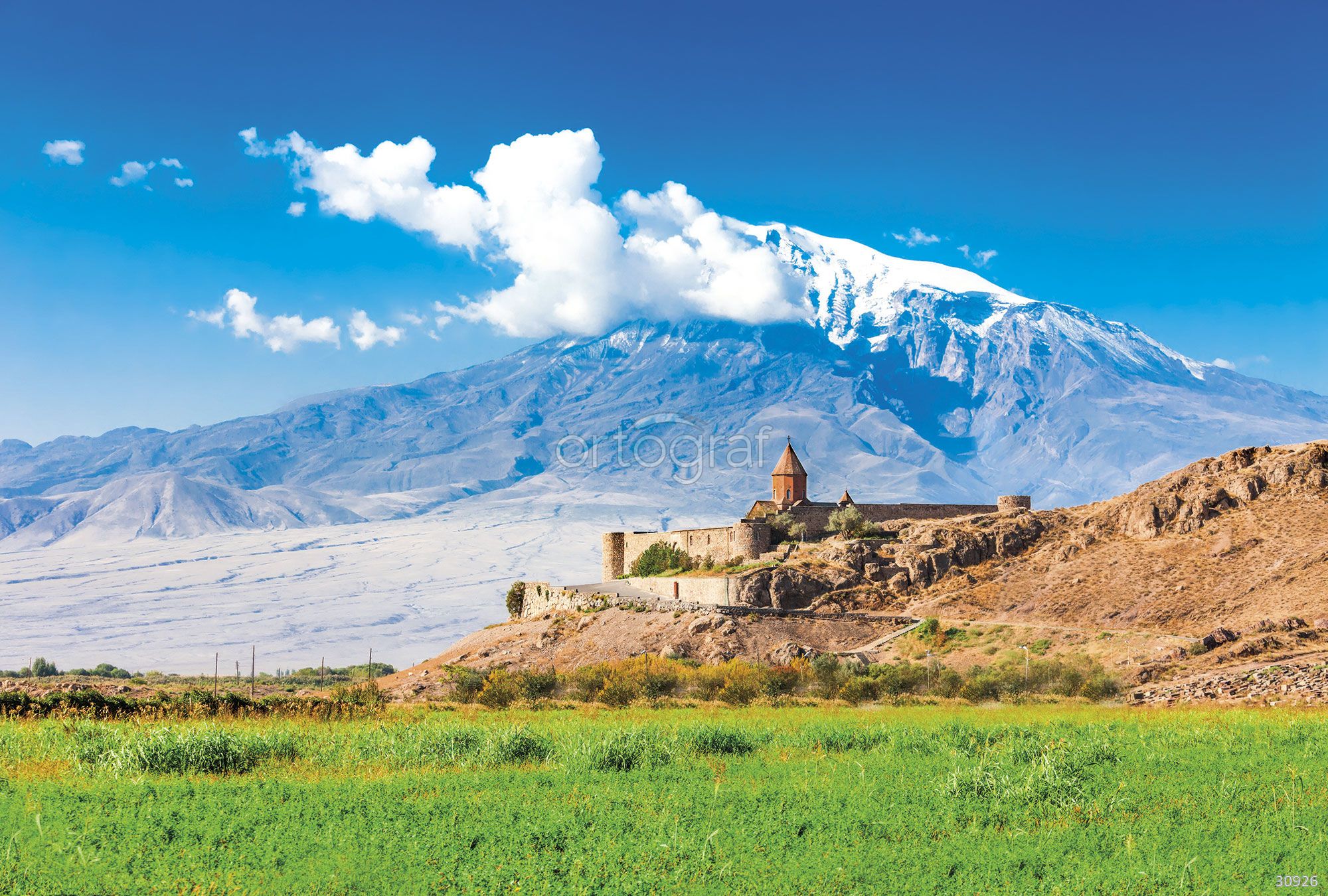 Величественный горный пейзаж с древним монастырём на фоне заснеженной вершины, окружённой ярко-зелёными полями и пологими холмами. Такая композиция подчеркивает атмосферу спокойствия, силы природы и исторической глубины, отлично расширяя пространство и делая интерьер выразительным.
