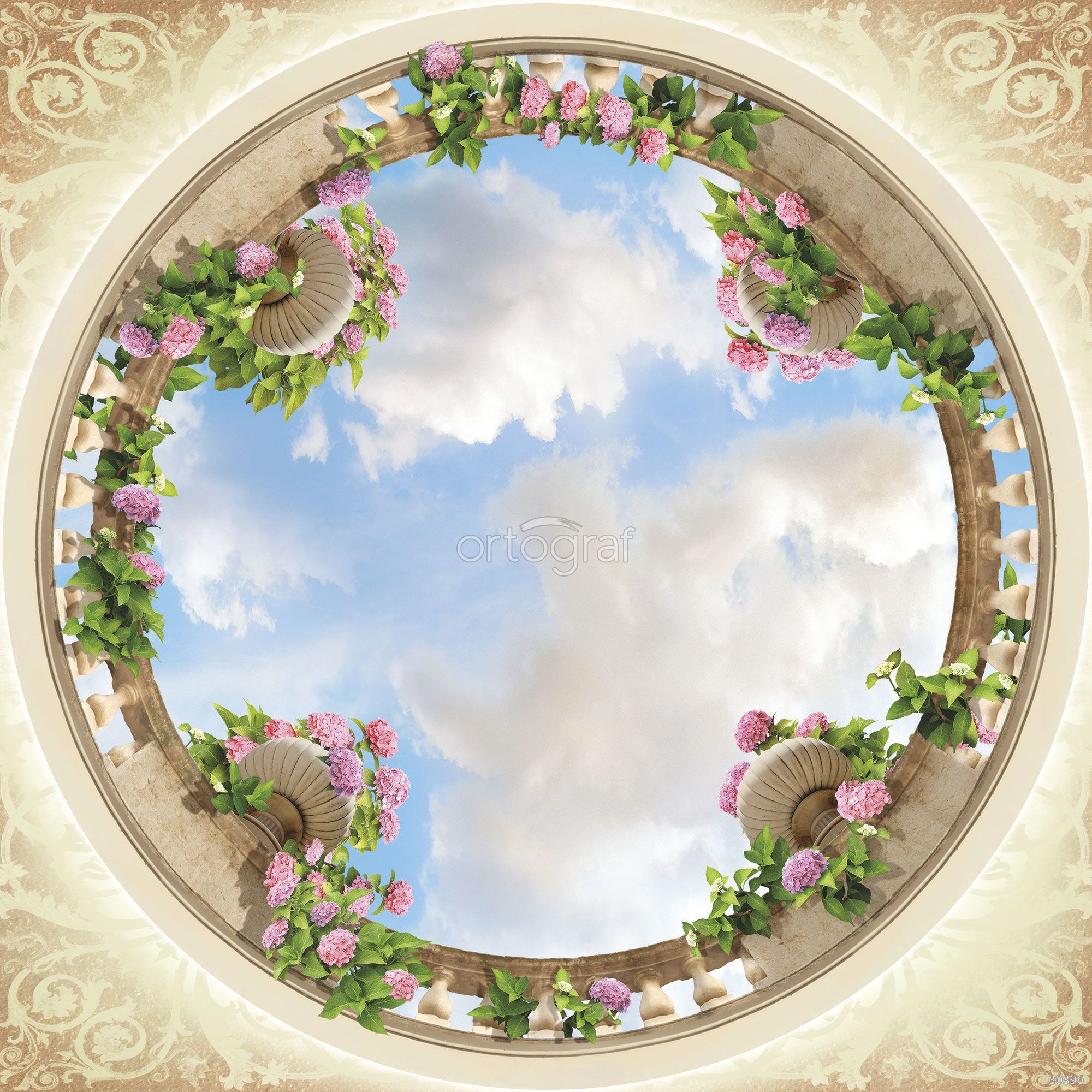На изображении представлен вид вверх сквозь круглое балюстрированное ограждение, оплетённое лианами и цветущими бутонами в декоративных вазах. В центре композиции изображено открытое небо с облаками, создающее ощущение простора и гармонии классического сада или террасы.