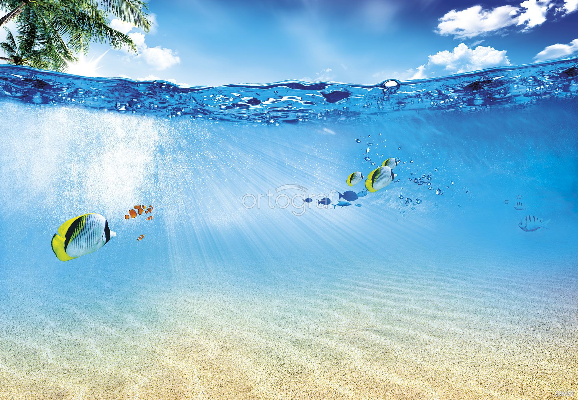 Морское дно с лучами света, которые проникают через водную гладь, и плавающими тропическими рыбами создает ощущение легкости, простора и умиротворения. Такое изображение помогает визуально увеличить пространство, формируя атмосферу спокойствия и отдыха. Отлично подойдет для оформления помещений с целью создания атмосферы свежести и легкости.