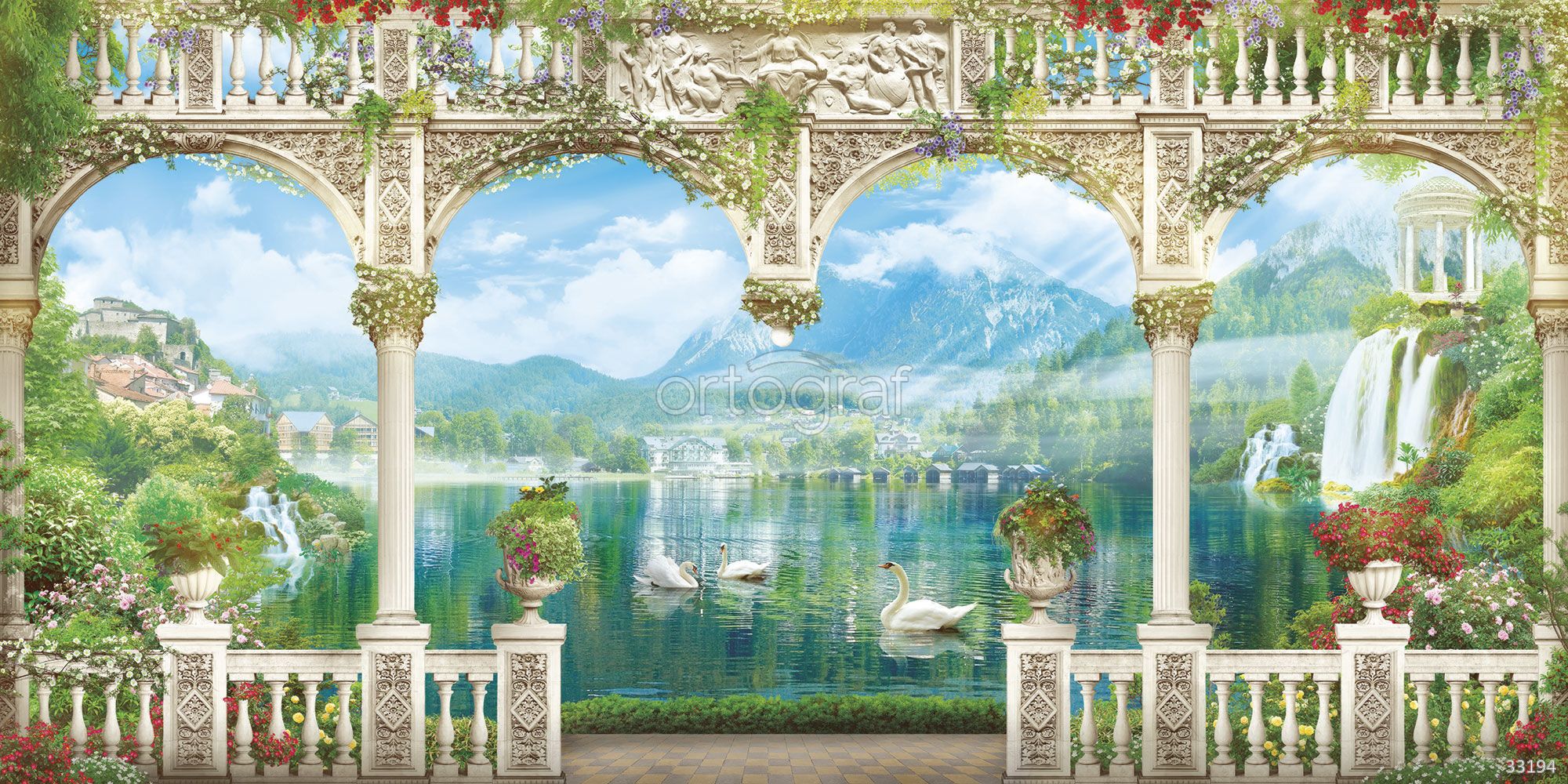 На изображении представлен восхитительный вид с террасы на спокойное озеро, окружённое горами, водопадами, строениями и лебедями на воде. Архитектурные элементы, колонны и резные балюстрады создают ощущение уюта и классики, а вид на природу добавляет романтики и гармонии. Такой сюжет привнесёт атмосферу спокойствия и элегантности в интерьер.