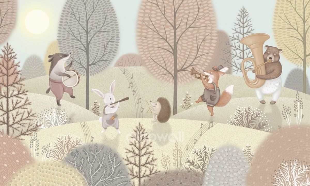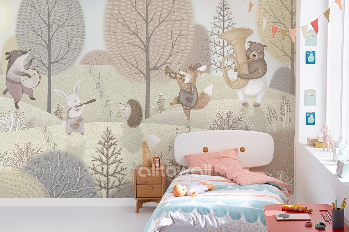 Обои для детской комнаты в пастельных тонах с милыми лесными зверятами.