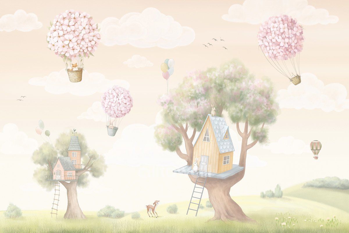 Летний день – сюжет для детских комнат, посвящённый сказочной сцене из жизни леса. Умиротворяющая картина изображает небольшой уютный дом на дереве, семейку зайчат, лисичек и кроликов. Особая техника рисунка напоминает контуры, нанесённые пастельными мелками.