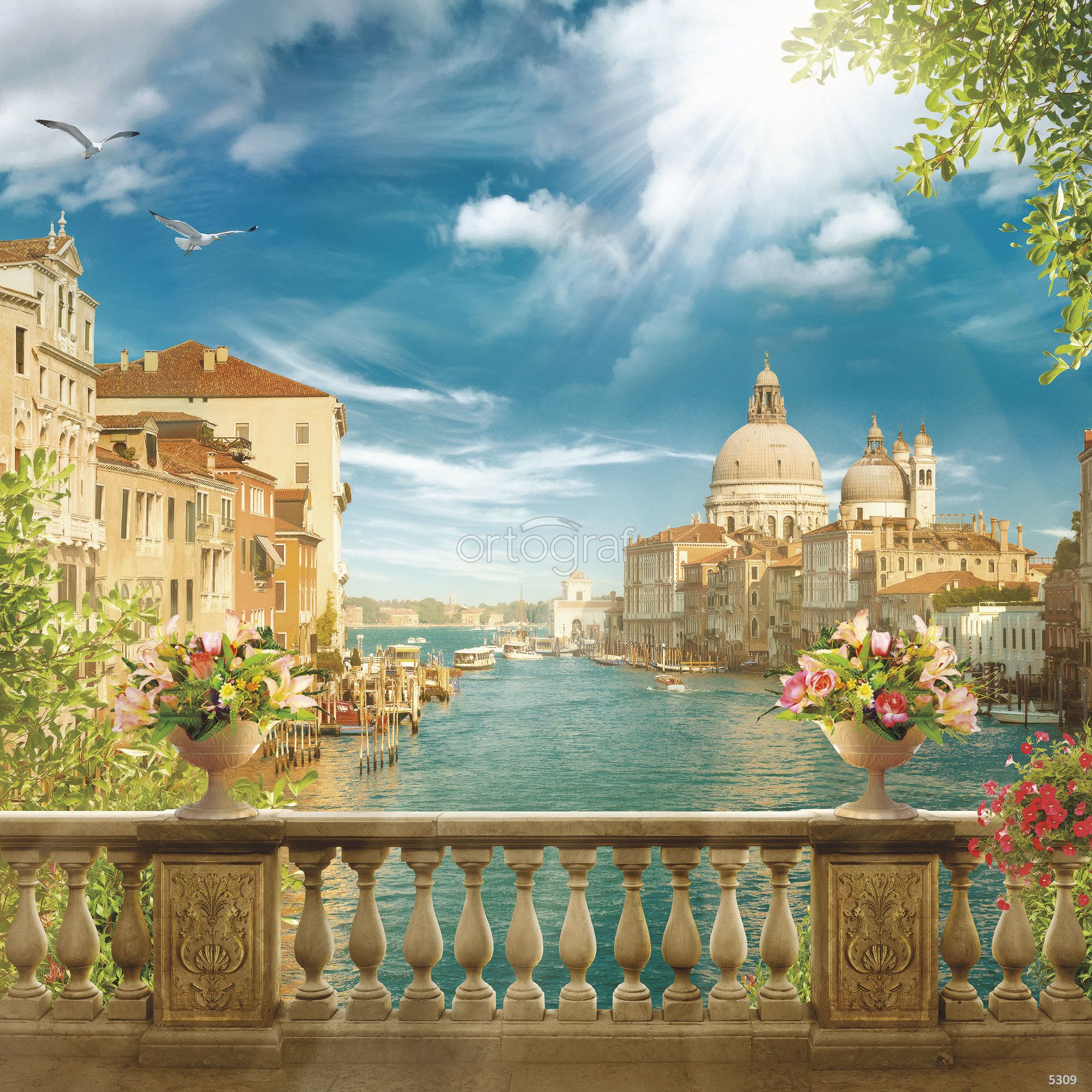 На изображении показан вид с балкона на канал, окружённый классической европейской архитектурой, с цветочными вазонами на переднем плане и пролетевшими чайками. На заднем плане узнаётся базилика Санта-Мария-делла-Салюте, знаменитая достопримечательность Венеции. Такой сюжет отлично впишется в гостиную, спальню или столовую, придавая помещению ощущение простора, света и южного очарования.
