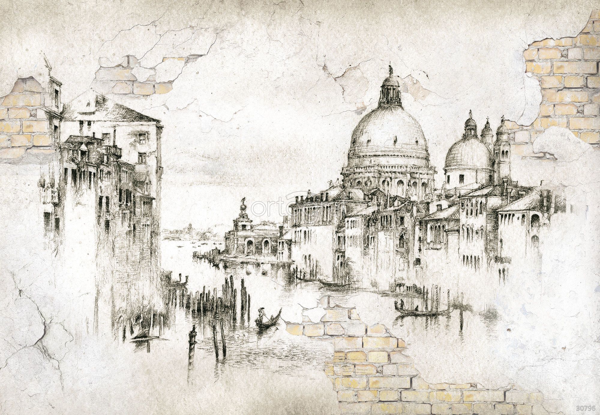 Графический набросок Венеции с каналом, гондолами и купольным собором на фоне состаренной стены с фрагментами кирпича создает атмосферу истории, романтики и искусства. Такой рисунок отлично подойдет для акцентной стены в классическом или творческом интерьере, придавая ему индивидуальность.