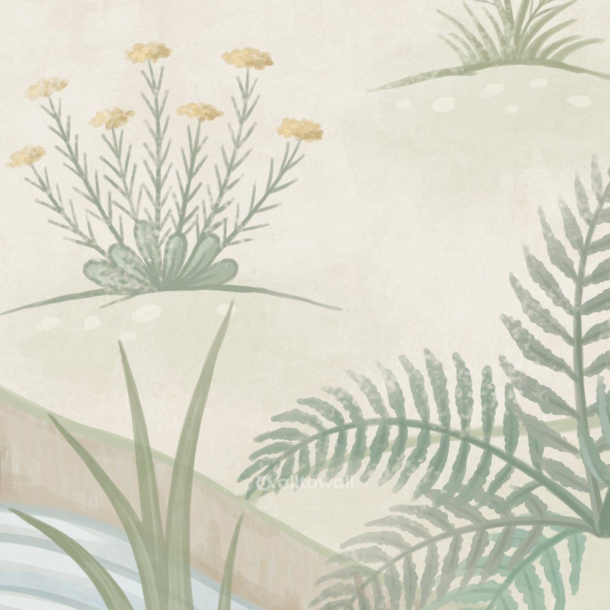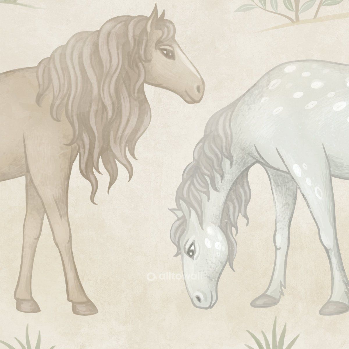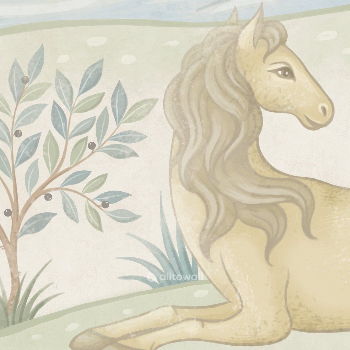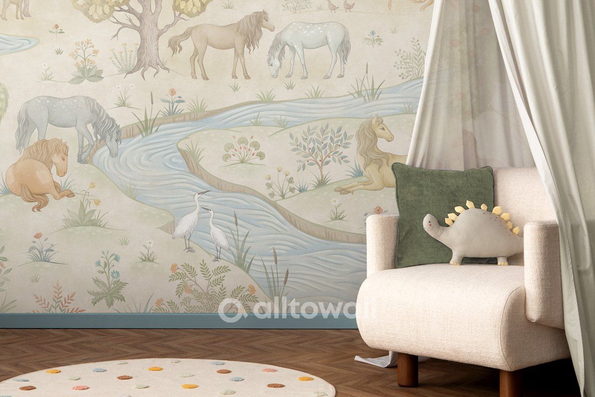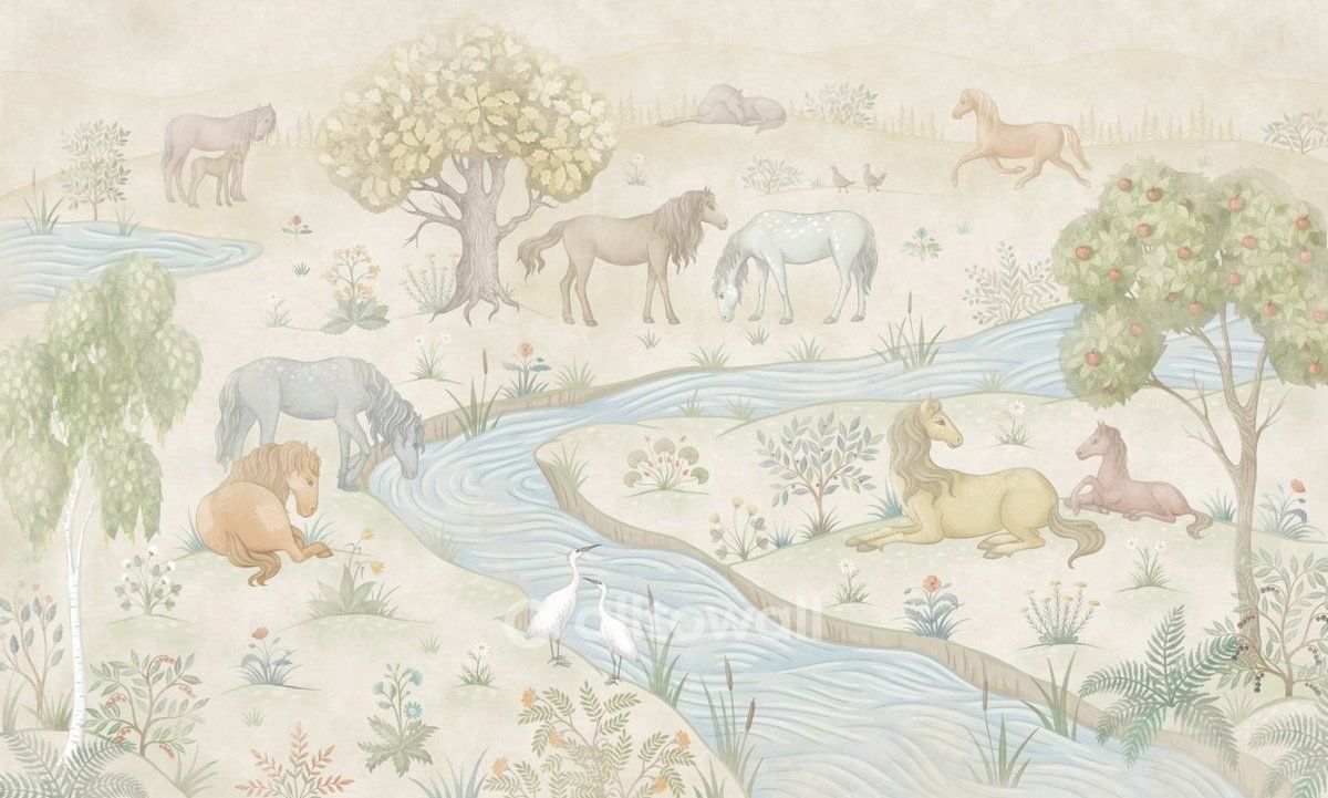 Обои в нежных оттенках песочного, зелёного и голубого для детской мальчика или девочки. Здесь лошадки с большими и добрыми глазами пасутся на лугу и пьют воду из речки. Самые внимательные заметят в сюжете даже аистов и курочек. Такие разные деревья, цветы и кустарники с полезными ягодами — этот сюжет можно рассматривать часами и каждый раз находить в нём что-то новое.