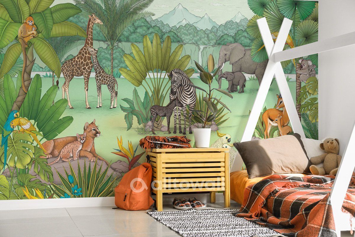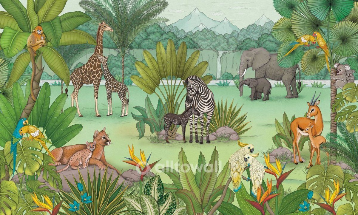 Мама и малыш-2 – серия покрытий, посвящённых природным сюжетам. Это африканские джунгли, среди зарослей которых прогуливаются семейки животных с малышами. Яркие, насыщенные краски и умиротворяющие изображения делают обои оптимальным решением для комнаты девочки или мальчика, оформленной в тропическом стиле.