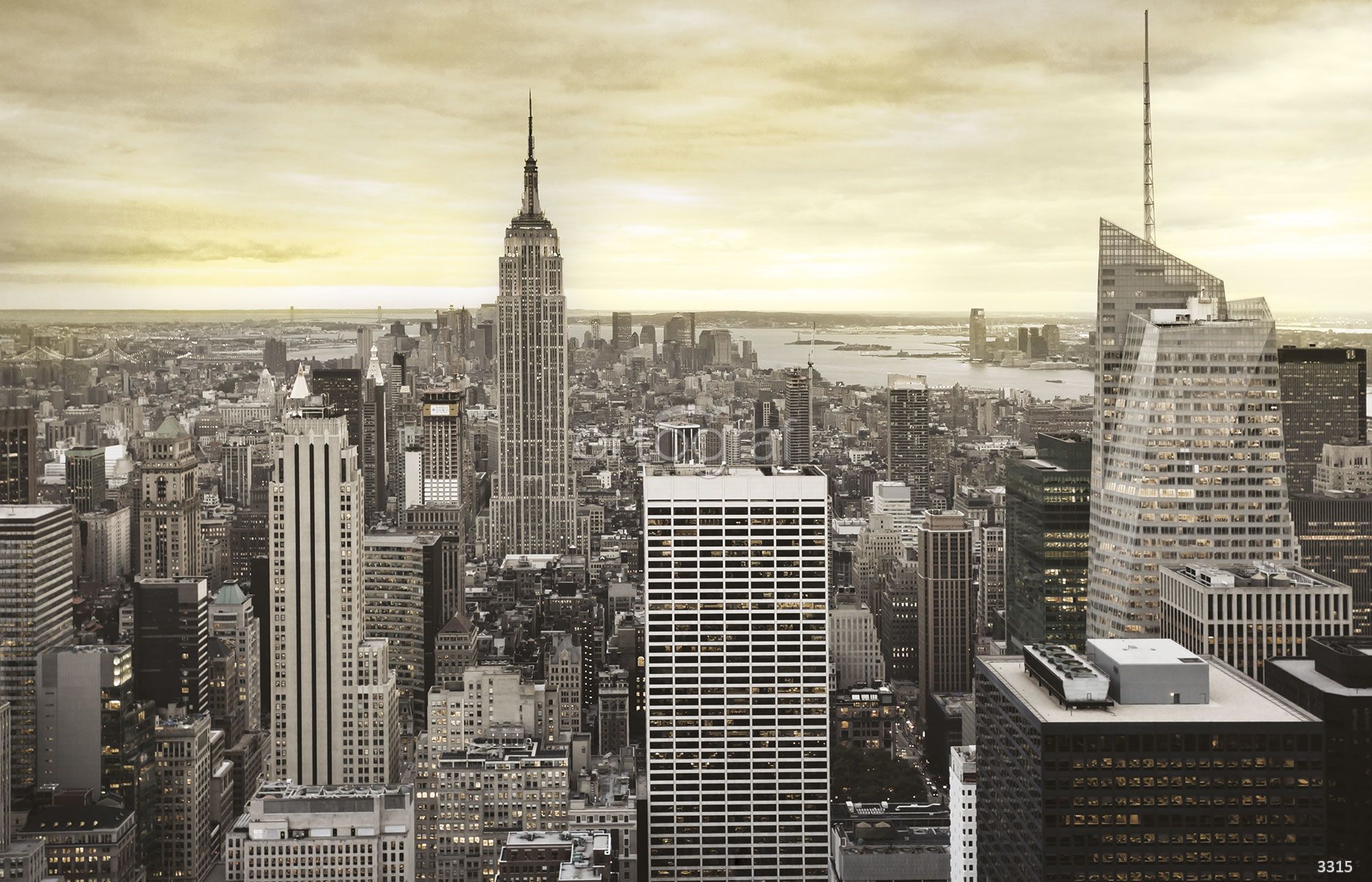 Панорамный вид на городской пейзаж с высотными зданиями и знаменитым небоскрёбом в центре создает ощущение ритма большого мегаполиса. Изображение подчеркивает энергию, масштаб и современность пространства, добавляя динамичности интерьеру. Такой сюжет хорошо подойдет для оформления стильного и урбанистичного интерьера.