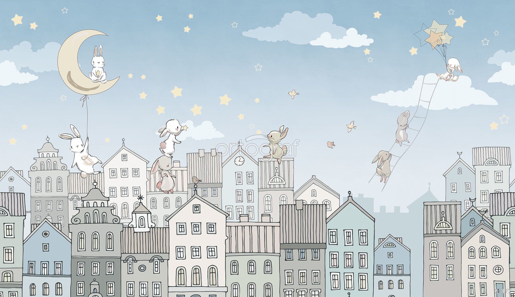 На фоне старинных европейских домиков изображены забавные кролики, которые сидят на крышах, летают среди облаков, лезут по лестнице на небо, ловят звёзды и сидят на луне. В композиции присутствуют звёзды, облака, воздушные шарики и птицы, создавая атмосферу сказки, мечты и уюта.