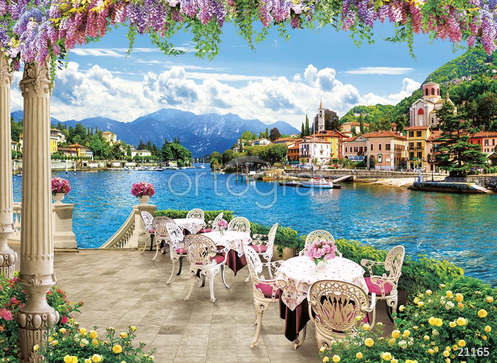 Терраса с изящными коваными столами и стульями украшена цветами и выходит на берег живописного залива, вдоль которого раскинулся уютный город с церковью и домиками на фоне гор. По периметру террасы — колонны и пышная цветущая зелень, создающие атмосферу спокойного отдыха в стиле средиземноморского курорта.