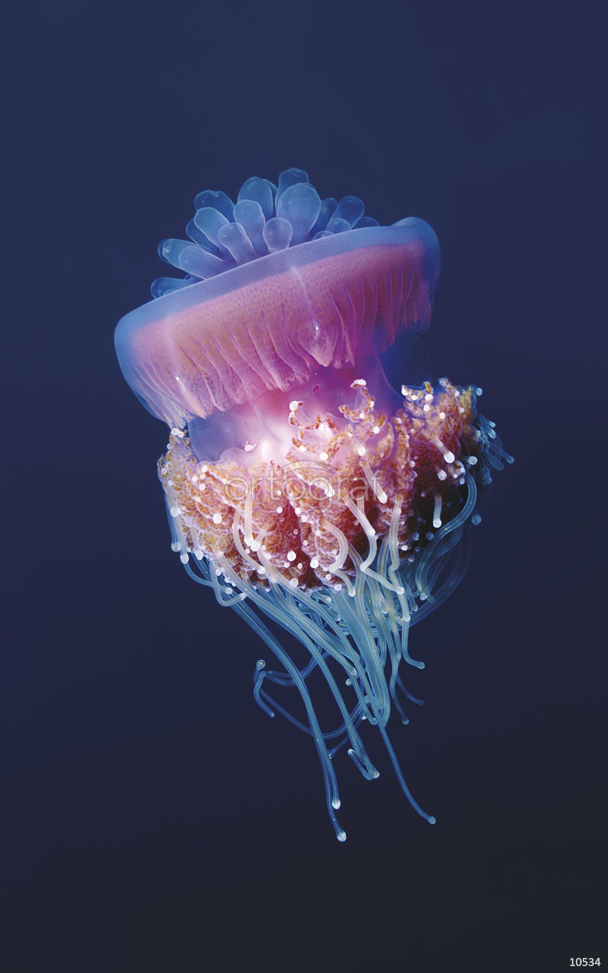 На иллюстрации изображено медузу с пышными щупальцами и куполообразным телом, создающую впечатление грациозного движения в толще воды. Форма и детали подчёркивают загадочную и почти инопланетную природу этого морского существа — щупальца струятся вниз, а венчик усеян округлыми наростами, что придаёт композиции динамику и особую выразительность.