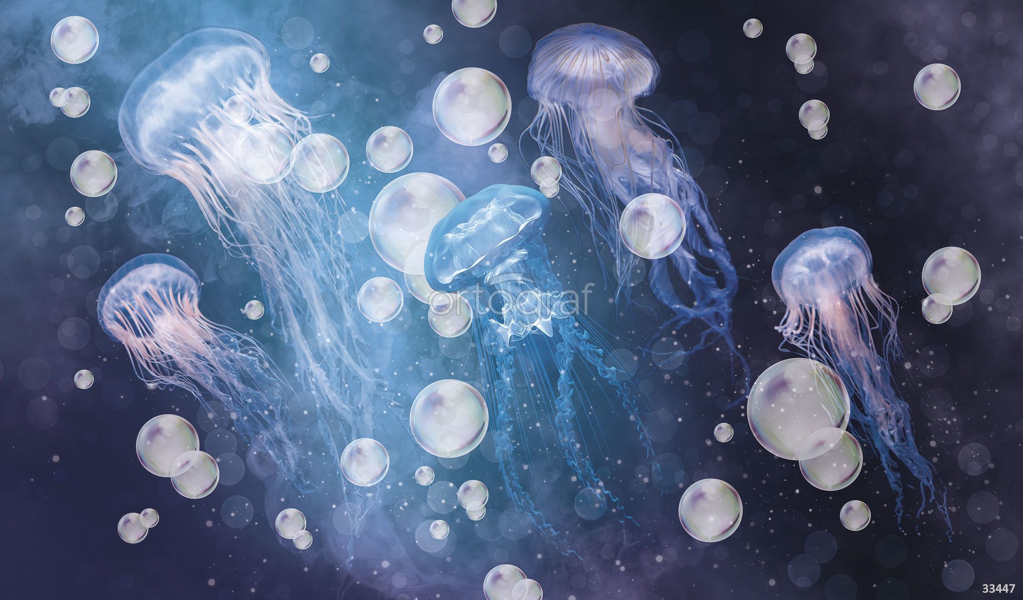 Изящные медузы и пузырьки, плавно парящие в водной среде, создают атмосферу загадочности и покоя. Рисунок наполнен мягкой динамикой и легкостью, отлично передает ощущение подводного мира и помогает расслабиться. Такой сюжет хорошо подойдет для помещений, где ценится необычное и умиротворяющее оформление.