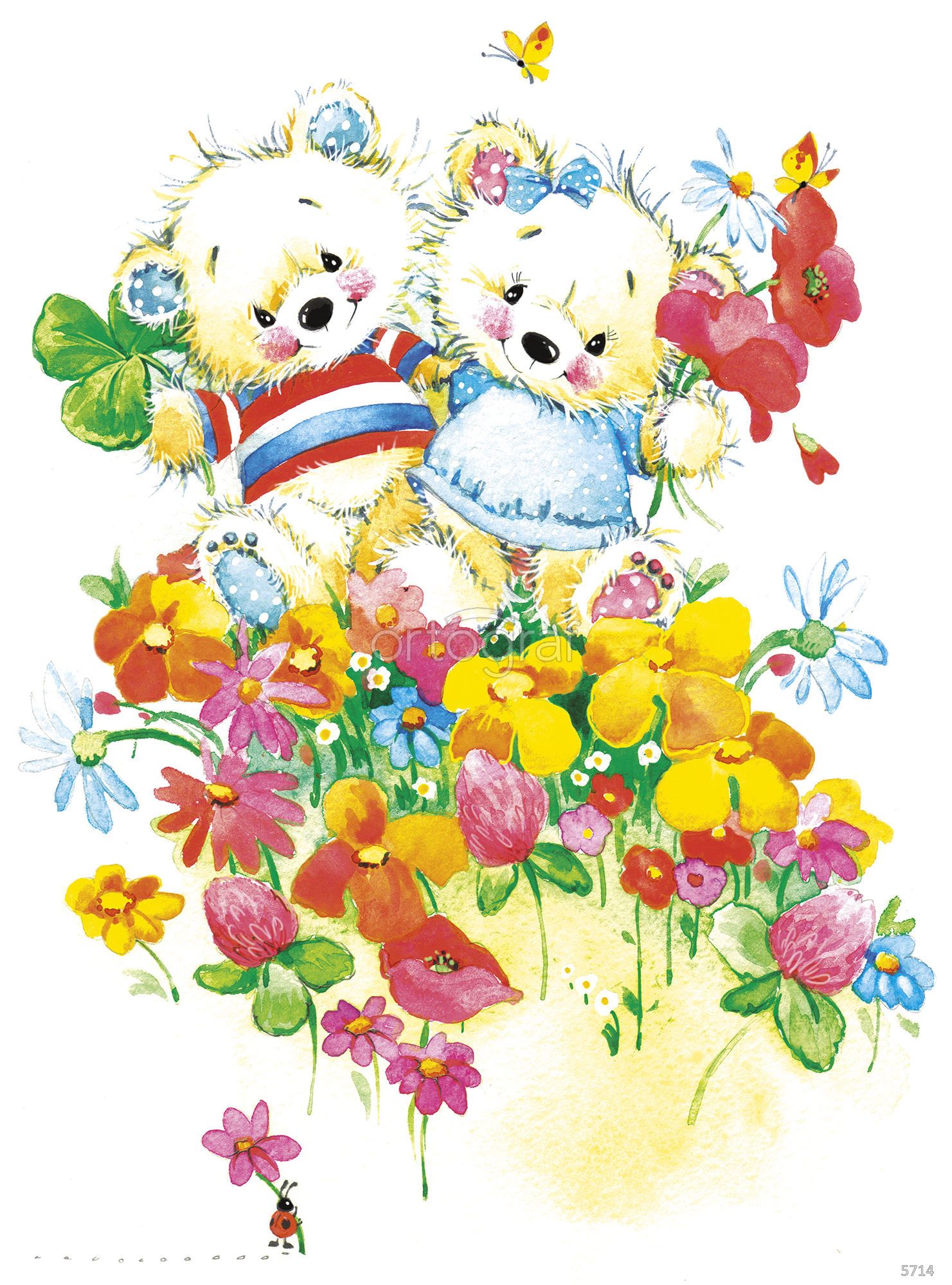 Два плюшевых мишки сидят на фоне букета полевых цветов, вокруг бабочки и божья коровка, атмосфера радости, лета и дружбы. Такой сюжет приносит ощущение уюта и сказки, хорошо подойдёт для оформления детских пространств или игровых зон.