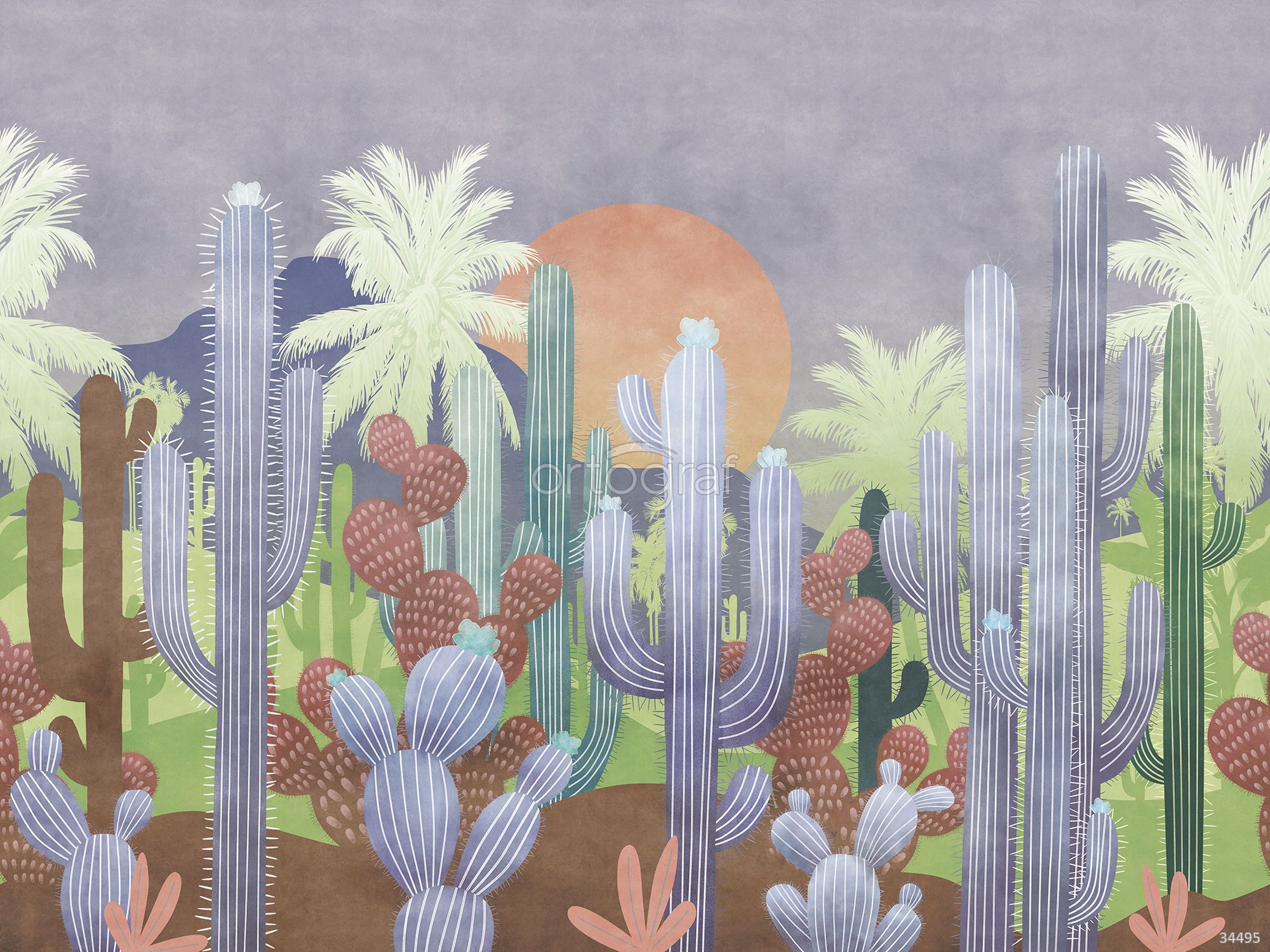 Рисунок с множеством кактусов, солнцем и силуэтами пальм передаёт атмосферу жаркой пустыни, заряжая энергией и ощущением приключений. Такой сюжет вносит в интерьер нотки экзотики и природного минимализма, идеально подходит для современных и креативных пространств. Идеален для комнат, где хочется добавить яркий природный акцент и создать необычное настроение.