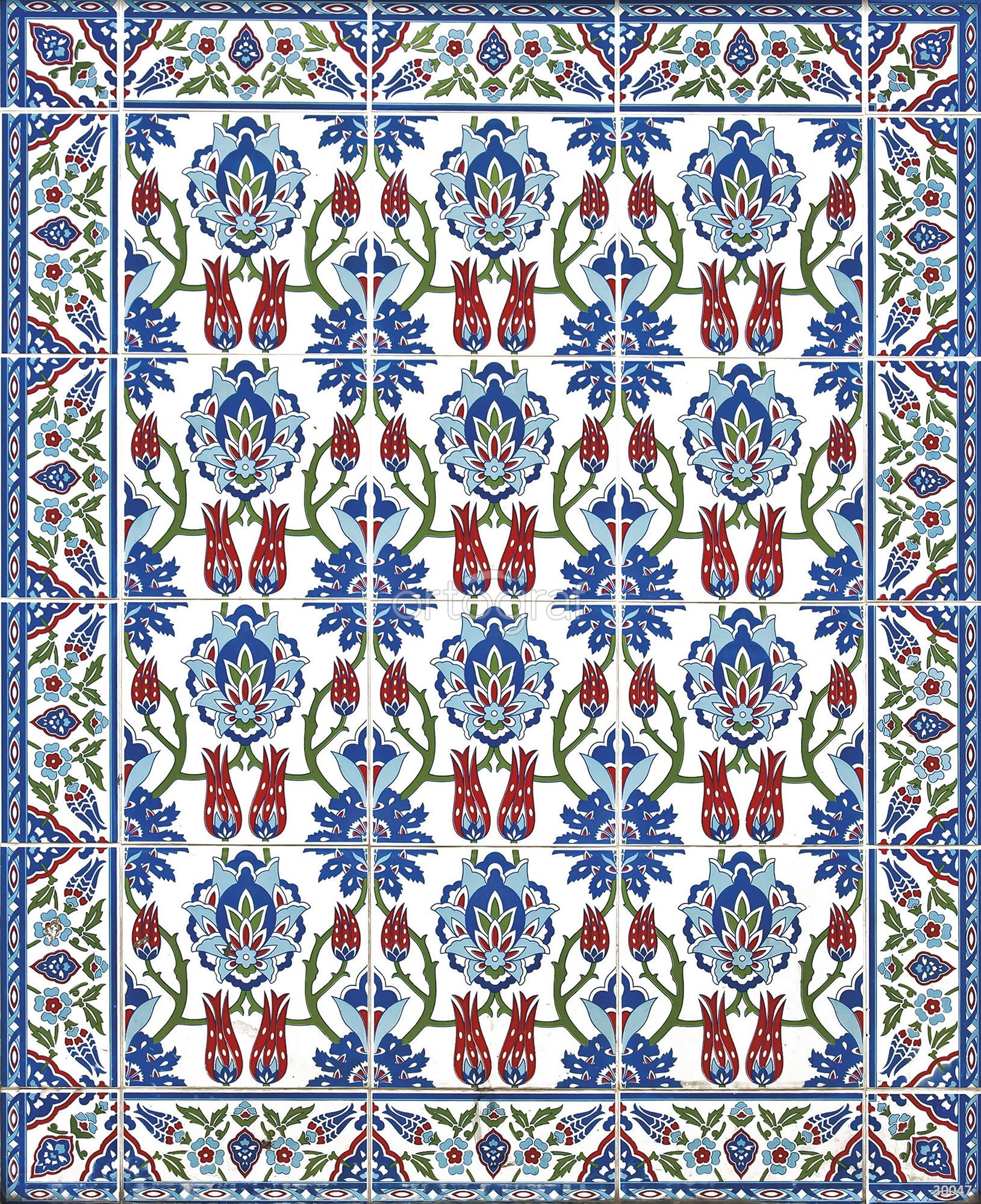 Традиционный турецкий керамический орнамент с симметричным растительным узором, выполненный в синих, красных и зелёных тонах. Основу композиции составляют стилизованные цветы тюльпанов и лотосов, характерные для изразцов из Изника, а декоративная рамка дополняет восточный колорит.