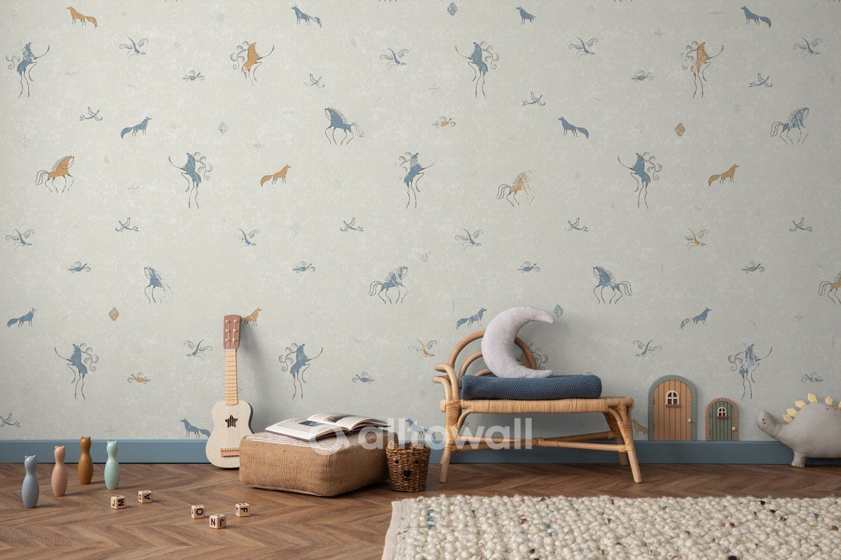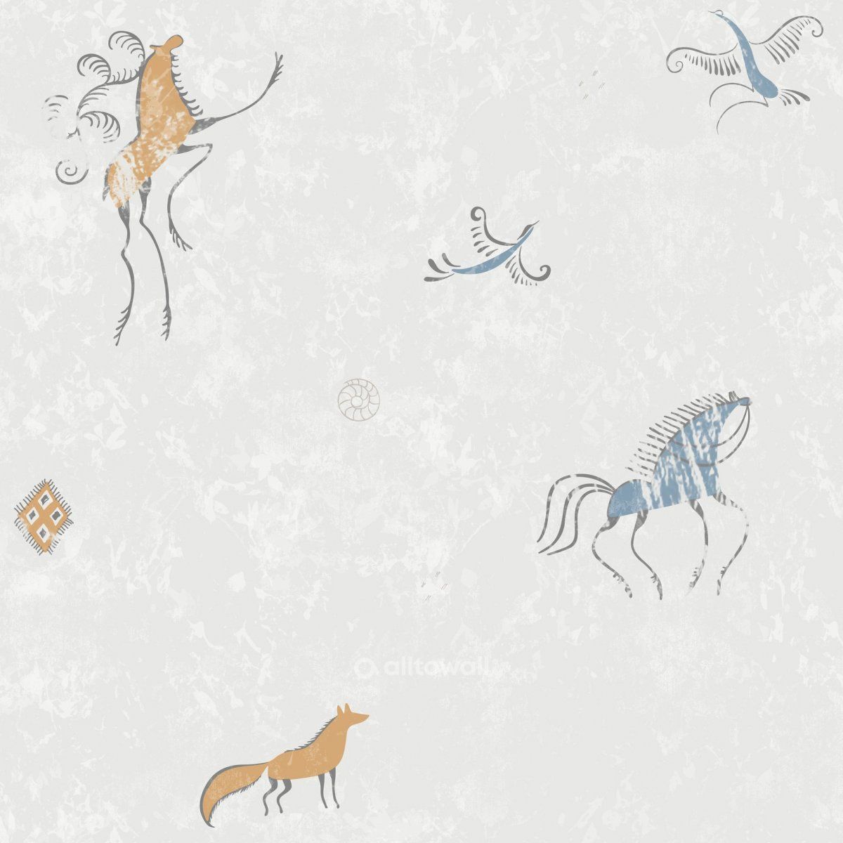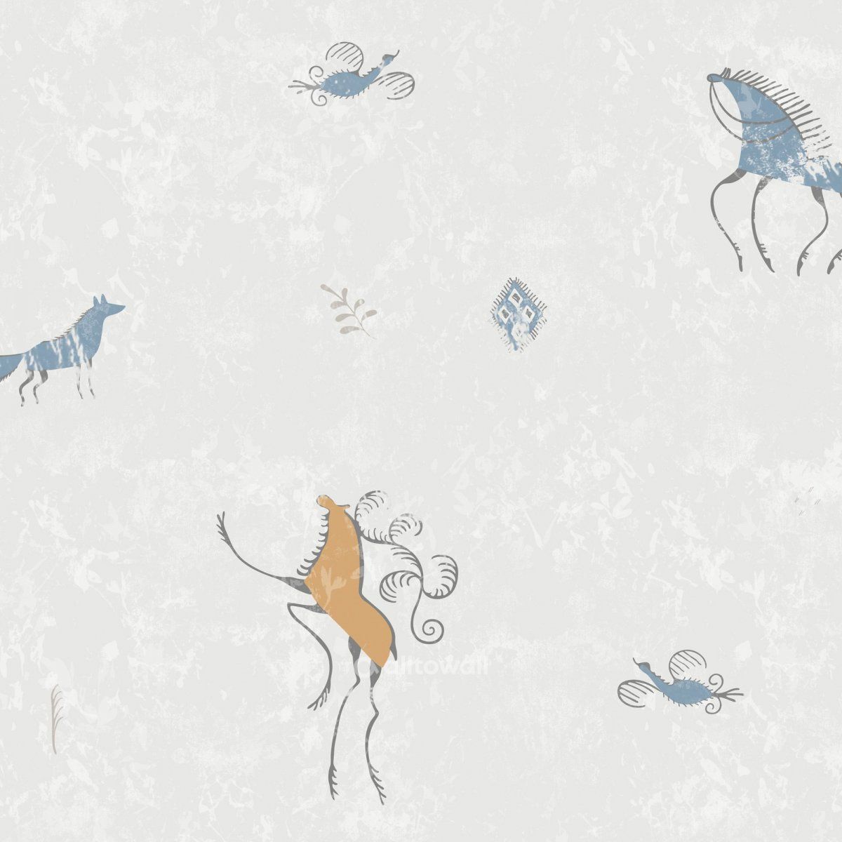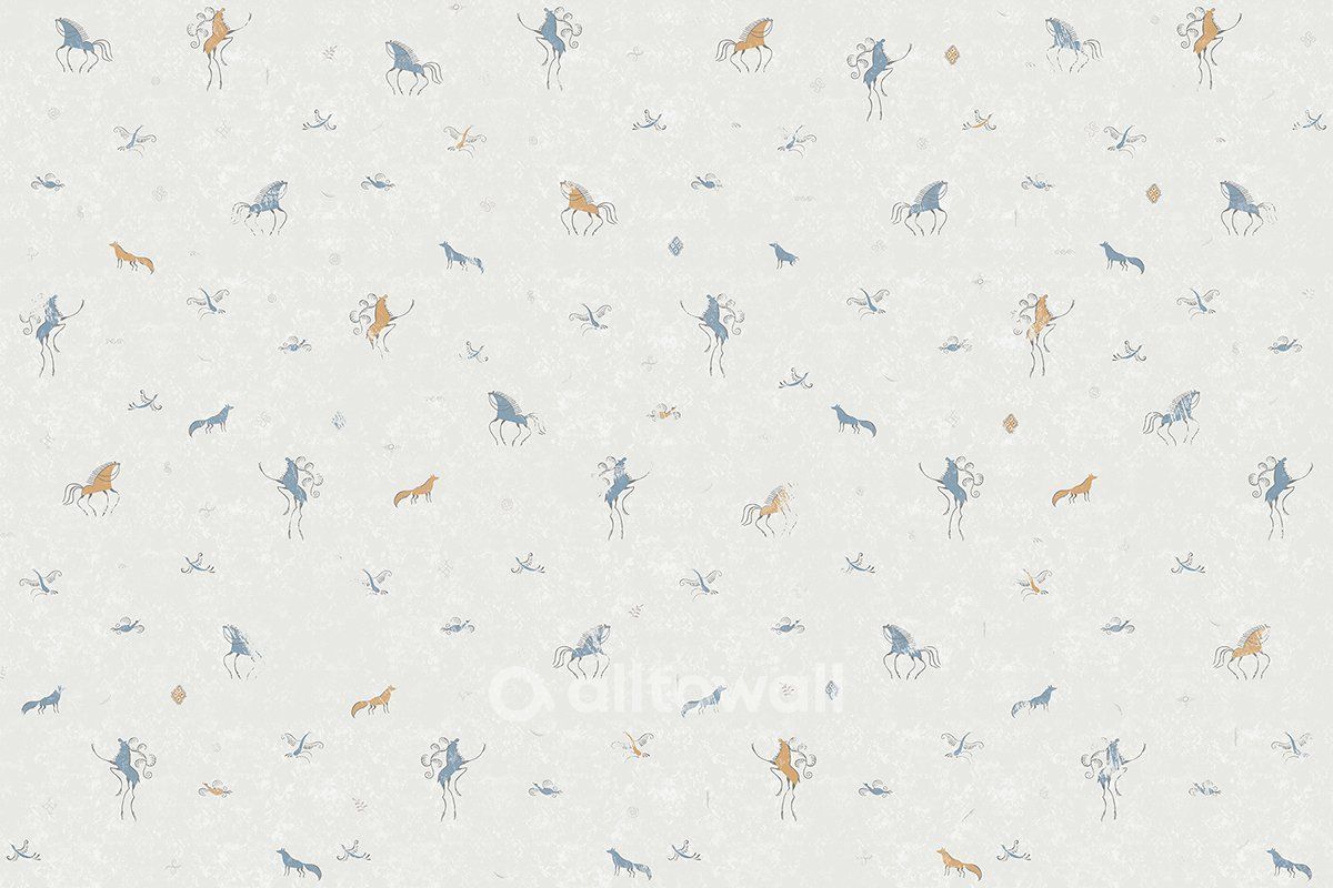 Обои, вдохновленные старейшими традициями художественных промыслов русского севера. «Мезенская сказка-2» — это принт с лошадками, оленями и лисичками в синих и горчичных оттенках для вашей детской.