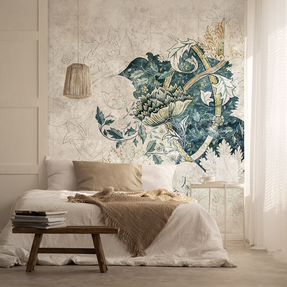 MORRIS – обои, посвященные нестареющей классике и флористической тематике. Рисунок отличается необычным дизайнерским подходом – фон выполнен в виде едва намеченных тонких линий и контуров растений, центральная часть ярко выделяется насыщенными оттенками и крупными бутонами, которые словно прорываются в наш мир из легкой туманной дымки. Такое решение придает эффект глубины, создает фокус на изображении.