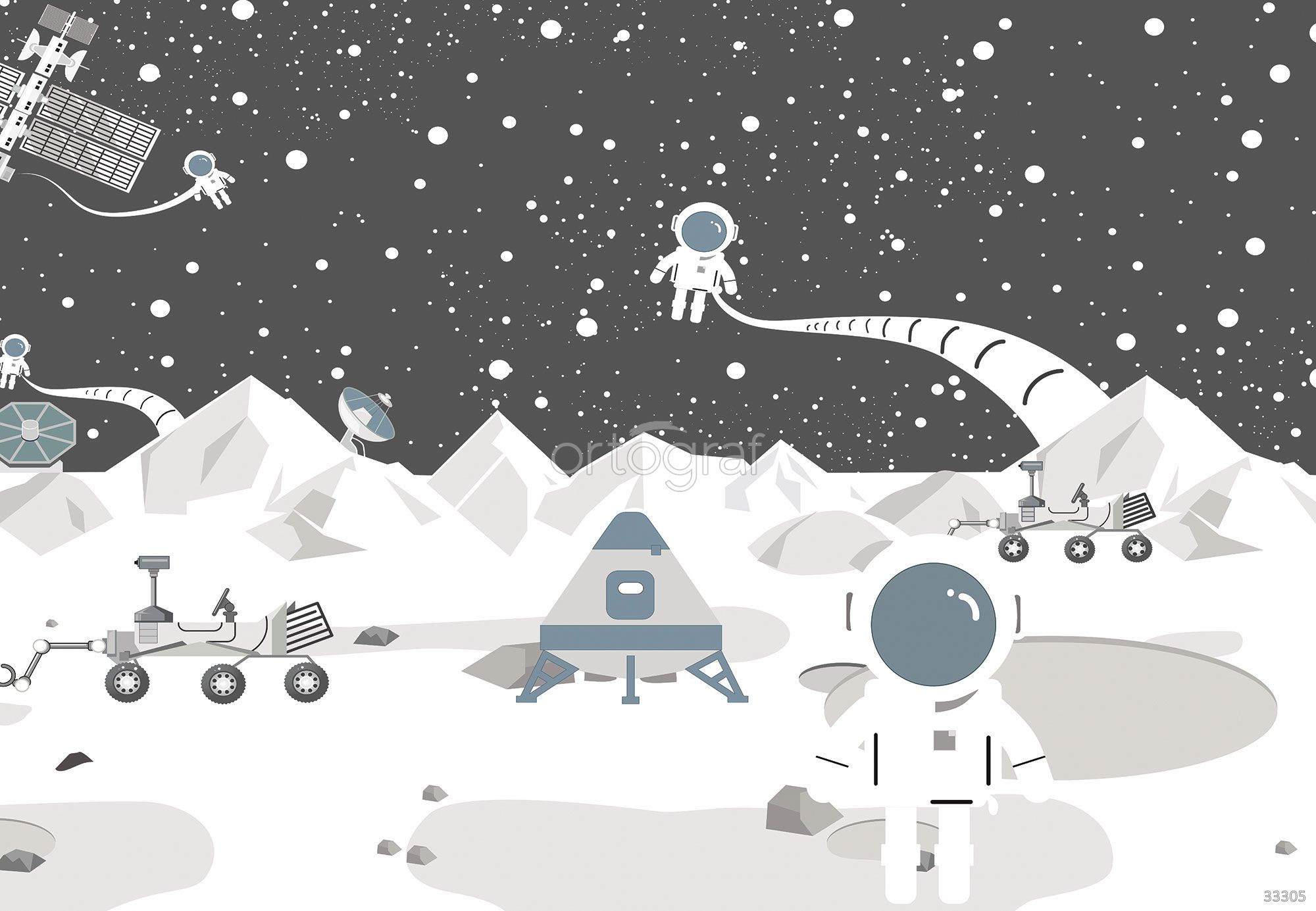 Сюжет с исследователями космоса на поверхности планеты или Луны включает астронавтов, луноходы, спутники и посадочный модуль, а фон украшен звездным небом и горами. Иллюстрация помогает познакомить с темой космоса и отлично подходит для пробуждения интереса к науке и открытиям. Такой рисунок создаст атмосферу вдохновения в современном или детском пространстве.