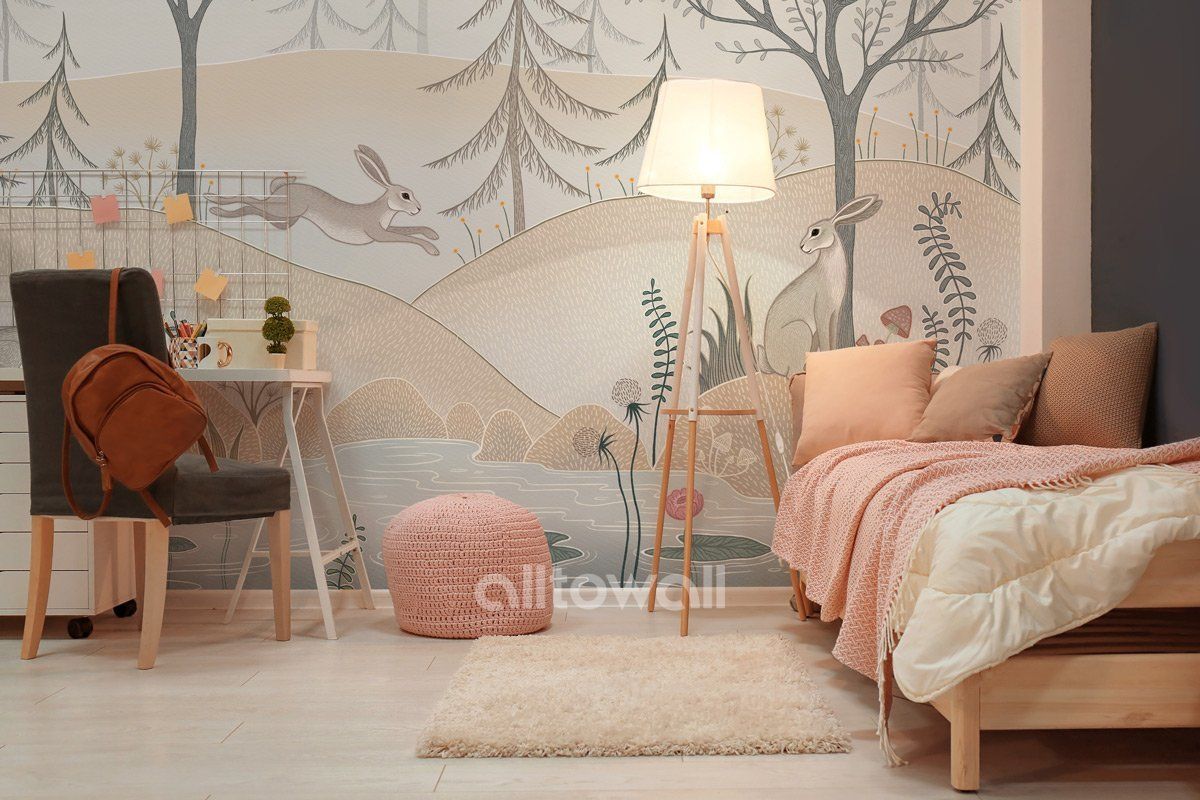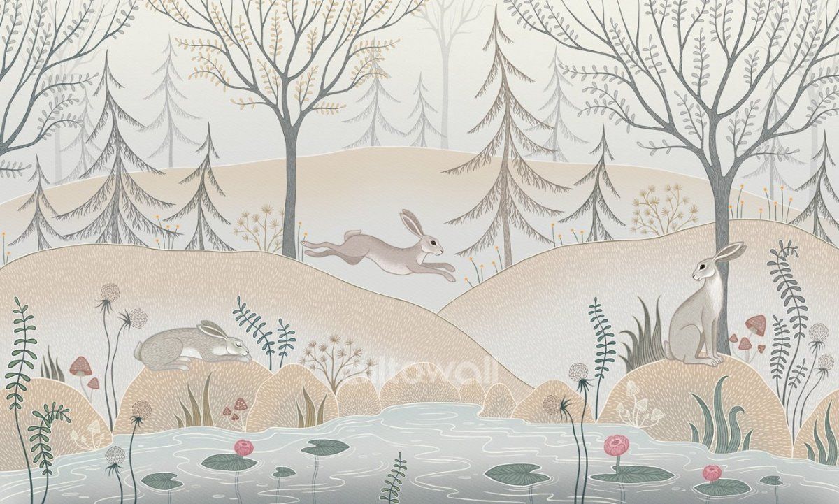 На опушке леса-1 – сказочная история о приключениях зайцев на освещённой солнцем лесной поляне. Основной сюжет посвящён животным. Зайцы отдыхают среди деревьев, скачут на пригорке или любуются кувшинками в пруду. Такие обои станут отличным решением для фонового оформления в комнате ребёнка младшего возраста, помогут сделать пространство уютным и гармоничным.